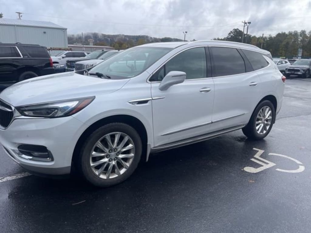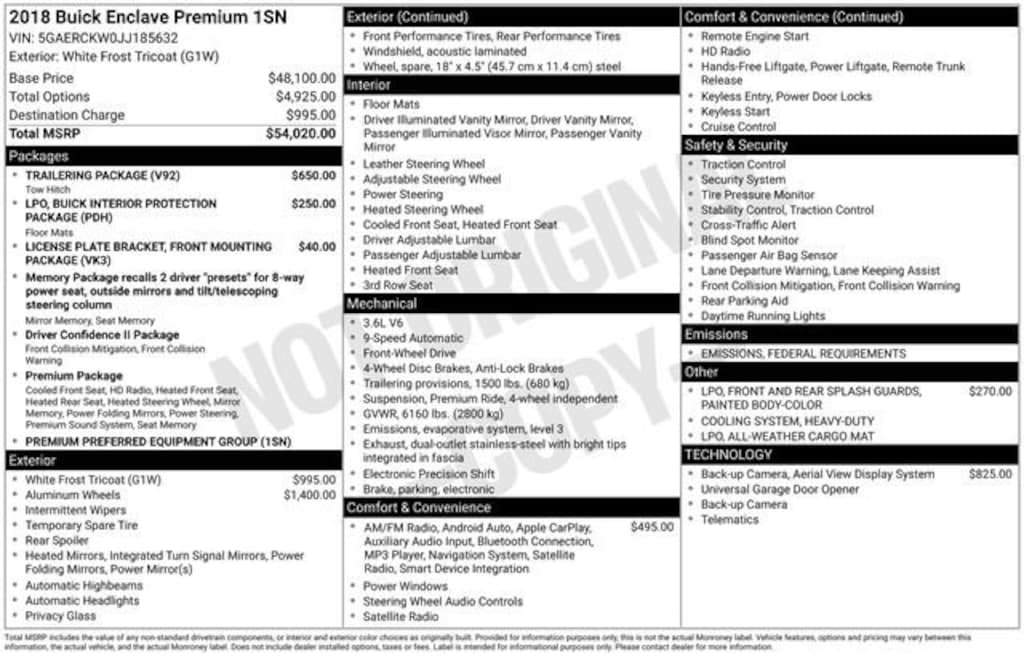 White Frost Tricoat 2018 Buick Enclave Premium Group FWD 9-Speed Automatic 3.6L V6 SIDI VVT FWD, 10 Speakers, 120-Volt Power Outlet, 18 Painted Aluminum Wheels, 20 Polished Aluminum Wheels, 3.49 Axle Ratio, 3rd Row 60/40 Power Fold Split-Bench, 3rd Row All-Weather Floor Mats, 3rd row seats: split-bench, 4-Wheel Disc Brakes, 5000lbs Trailering Package, 7-Passenger Seating, ABS brakes, Air Conditioning, All-Weather Cargo Mat (LPO), All-Weather Floor Mats, Alloy wheels, AM/FM radio: SiriusXM, Apple CarPlay/Android Auto, Audio memory, Auto High-beam Headlights, Auto tilt-away steering wheel, Auto-dimming door mirrors, Auto-dimming Rear-View mirror, Automatic temperature control, Bird's Eye View Surround Vision, Body-Color Painted Front/Rear Splash Guards (LPO), Bose Performance-Enhanced Premium 10-Speaker Syst, Brake assist, Buick Interior Protection Package (LPO), Bumpers: body-color, Compass, Delay-off headlights, Driver door bin, Driver vanity mirror, Dual front impact airbags, Dual front side impact airbags, Electronic Stability Control, Emergency communication system: OnStar Guidance, Four wheel independent suspension, Front anti-roll bar, Front Bucket Seats, Front Center Armrest, Front dual zone A/C, Front License Plate Mounting Bracket, Front reading lights, Fully automatic headlights, Garage door transmitter, HD Radio, Heated 2nd Row Outboard Seats, Heated door mirrors, Heated Driver & Front Passenger Seats, Heated front seats, Heated rear seats, Heated Steering Wheel, Heated steering wheel, Heavy-Duty Cooling System, Illuminated entry, Inside Rearview Mirror w/Full Camera Display, Leather steering wheel, Low tire pressure warning, Memory Package, Memory seat, Navigation System, Occupant sensing airbag, Outside Heated Power-Adjustable Mirrors, Outside temperature display, Overhead airbag, Overhead console, Panic alarm, Passenger door bin, Passenger vanity mirror, Perforated Leather-Appointed Seat Trim, Power door mirrors, Power Driver Lumbar Control Seat Adjuster, Power driver seat, Power Liftgate, Power Passenger Lumbar Control Seat Adjuster, Power passenger seat, Power steering, Power Tilt & Telescopic Steering Column, Power windows, Preferred Equipment Group 1SN, Premium audio system: Buick Infotainment System, Premium Package, Radio data system, Radio: Buick Infotainment Sys AM/FM Stereo w/Nav, Radio: Buick Infotainment System AM/FM Stereo, Rear air conditioning, Rear anti-roll bar, Rear reading lights, Rear window defroster, Rear window wiper, Remote keyless entry, Roof rack: rails only, Security system, SiriusXM Satellite Radio, Speed control, Speed-sensing steering, Spoiler, Steering wheel memory, Steering wheel mounted audio controls, Tachometer, Telescoping steering wheel, Tilt steering wheel, Traction control, Trip computer, Turn signal indicator mirrors, Variably intermittent wipers, Ventilated Driver & Front Passenger Seats, Ventilated front seats, Voltmeter.