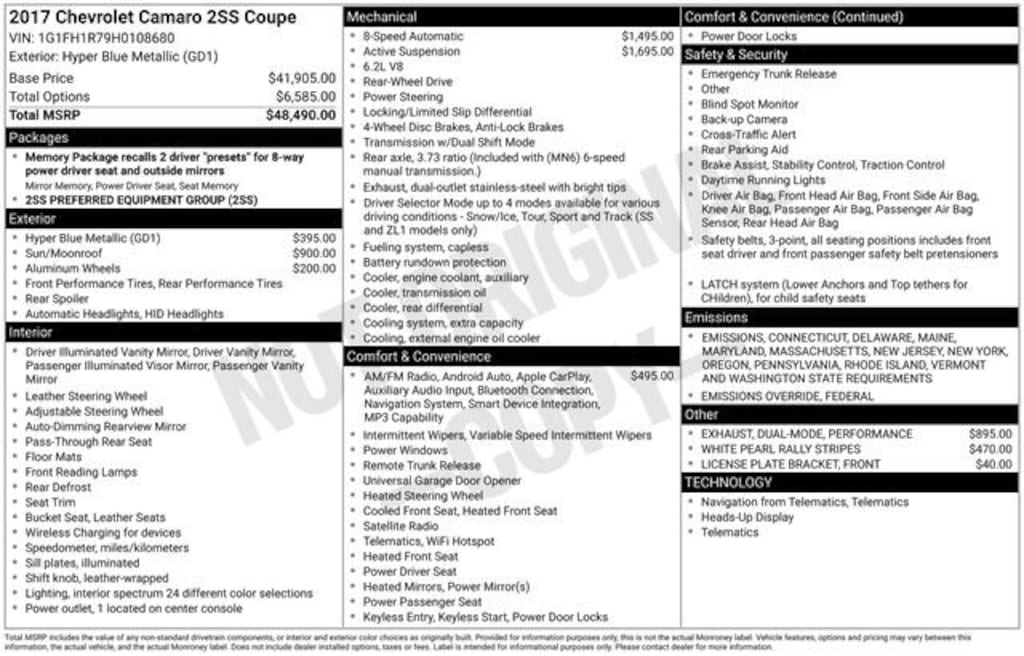 Hyper Blue Metallic 2017 Chevrolet Camaro SS 2SS RWD 8-Speed Automatic 6.2L V8 2 USB Ports & Auxiliary Input Jack, 2.77 Rear Axle Ratio, 4-Wheel Disc Brakes, 9 Speakers, ABS brakes, Air Conditioning, Alloy wheels, AM/FM radio: SiriusXM, Apple CarPlay/Android Auto, Auto-dimming door mirrors, Auto-dimming Rear-View mirror, Automatic temperature control, Bose Premium 9-Speaker Audio System Feature, Brake assist, Bumpers: body-color, Compass, Delay-off headlights, Driver door bin, Driver vanity mirror, Dual front impact airbags, Dual front side impact airbags, Dual Mode Performance Exhaust, Electronic Stability Control, Emergency communication system, Exterior Parking Camera Rear, Four wheel independent suspension, Front anti-roll bar, Front Bucket Seats, Front Center Armrest, Front dual zone A/C, Front fog lights, Front License Plate Bracket, Front reading lights, Front Sport Bucket Seats, Fully automatic headlights, Garage door transmitter, Heads-Up Display, Heated door mirrors, Heated front seats, Heated steering wheel, High-Intensity Discharge Headlights, Illuminated entry, Knee airbag, Leather Shift Knob, Leather-Trimmed Seat Trim, Low tire pressure warning, Magnetic Ride Control, Memory seat, Occupant sensing airbag, Outside temperature display, Overhead airbag, Paddle-Shift Manual Controls, Panic alarm, Passenger door bin, Passenger vanity mirror, Power door mirrors, Power driver seat, Power passenger seat, Power steering, Power Sunroof, Power windows, Preferred Equipment Group 2SS, Premium audio system: Chevrolet MyLink, Radio data system, Radio: Chevrolet MyLink Audio System, Radio: Chevrolet MyLink w/Navigation, Rear anti-roll bar, Rear window defroster, Remote keyless entry, Remote Vehicle Starter System, Security system, SiriusXM Satellite Radio, Speed control, Speed-sensing steering, Spoiler, Steering wheel mounted audio controls, Tachometer, Telescoping steering wheel, Tilt steering wheel, Traction control, Trip computer, Variably intermittent wipers, Ventilated front seats, Voltmeter, Wheels: 20 x 8.5 Fr & 20 x 9.5 Rr 5-Spoke Alum, White Pearl Rally Stripes.