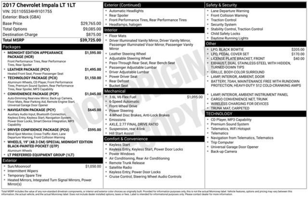 Black 2017 Chevrolet Impala LT 1LT FWD 6-Speed Automatic Electronic with Overdrive 3.6L V6 DI DOHC 100-Watt 6-Speaker System, 120-Volt Power Outlet, 18 Painted Alloy Wheels, 19 Aluminum Wheels, 3 USB Ports, 4-Way Manual Front Passenger Seat Adjuster, 4-Wheel Disc Brakes, 6 Speakers, 70AH Battery, 8-Way Power Driver Seat Adjuster, 8-Way Power Front Passenger Seat Adjuster, 8 Diagonal Color Infotainment Display, 800 Cold-Cranking Amps Battery, ABS brakes, Air Conditioning, Alloy wheels, AM/FM radio: SiriusXM, Ambient Instrument Panel Interior Lamp, Ambient Interior Door Lamp, Apple CarPlay, Auto-Dimming Inside Rear-View Mirror, Automatic temperature control, Black Bowtie (LPO) (DISC), Body-Color Surround Grille, Bose Centerpoint Surround Sound Premium System, Brake assist, Bumpers: body-color, Carpeted Trunk Mat, Compass, Convenience Package, Delay-off headlights, Driver Confidence Package, Driver door bin, Driver Power Lumbar Seat Adjuster, Driver vanity mirror, Dual front impact airbags, Dual front side impact airbags, Dual Stainless-Steel Exhaust, Electronic Stability Control, Emergency communication system: OnStar Guidance, Forward Collision Alert, Four wheel independent suspension, Front anti-roll bar, Front Black Bowtie, Front Bucket Seats, Front Center Armrest, Front dual zone A/C, Front License Plate Bracket, Front Passenger Power Lumbar Seat Adjuster, Front reading lights, Fully automatic headlights, Heated door mirrors, Heated Driver & Front Passenger Seats, Illuminated entry, Keyless Open, Keyless Start, Knee airbag, Lane Departure Warning System, Leather Package, Leather Seat Trim, Leather Shift Knob, Low tire pressure warning, Midnight Edition Appearance Package, Navigation Package, Occupant sensing airbag, Overhead airbag, Overhead console, Panic alarm, Passenger door bin, Passenger vanity mirror, Pedal Cover Set, Pedal Cover Set (LPO) (DISC), Power door mirrors, Power driver seat, Power steering, Power Tilt-Sliding Sunroof, Power windows, Preferred Equipment Group 1LT, Premium audio system: Chevrolet MyLink, Premium Carpeted Front & Rear Floor Mats, Premium Cloth/Leatherette Seat Trim, Radio data system, Radio: Chevrolet MyLink AM/FM Stereo, Radio: Chevrolet MyLink AM/FM Stereo w/CD & NAV, Rear anti-roll bar, Rear Black Bowtie, Rear Cross-Traffic Alert, Rear Park Assist, Rear reading lights, Rear seat center armrest, Rear side impact airbag, Rear Spoiler, Rear Vision Camera, Rear window defroster, Remote keyless entry, Remote Vehicle Starter System, Security system, Side Blind Zone Alert w/Lane Change Alert, Single-Outlet Stainless-Steel Exhaust, Single-Slot CD/MP3 Player, SiriusXM Satellite Radio, Speed control, Speed-sensing steering, Split folding rear seat, Steering wheel mounted audio controls, Stop-Start Engine Control System, Tachometer, Technology Package, Telescoping steering wheel, Tilt steering wheel, Traction control, Trip computer, Trunk Cargo Convenience Net, Turn signal indicator mirrors, Universal Home Remote, Variably intermittent wipers, Wheels: 19 Special Midnight Edition, Wireless Charging For Devices.