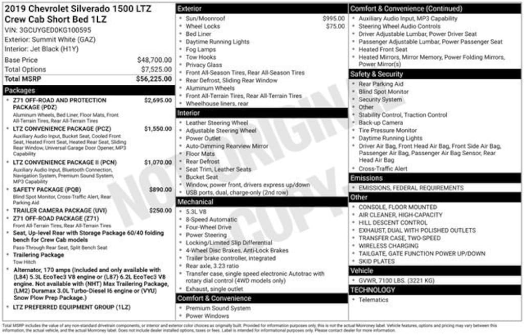 Summit White 2019 Chevrolet Silverado 1500 LTZ 4WD 8-Speed Automatic EcoTec3 5.3L V8 8-Speed Automatic, 4WD, Jet Black Leather, 10-Way Power Driver Seat w/Lumbar, 10-Way Power Passenger Seat Adjuster w/Lumbar, 12-Volt Rear Auxiliary Power Outlet, 120-Volt Bed Mounted Power Outlet, 120-Volt Instrument Panel Power Outlet, 170 Amp Alternator, 2 USB Ports (First Row), 2nd Row Heated Outboard Seats, 3.23 Rear Axle Ratio, 4-Wheel Disc Brakes, 4.2 Diagonal Color Display Driver Info Center, 40/20/40 Front Split-Bench Seat, 6 Speakers, 6-Speaker Audio System, ABS brakes, Advanced Trailering System, Air Conditioning, All-Weather Floor Liner (LPO) (AAK), Alloy wheels, AM/FM radio: SiriusXM, Apple CarPlay/Android Auto, Auto-dimming door mirrors, Auto-Dimming Inside Rear-View Mirror, Auto-dimming Rear-View mirror, Automatic temperature control, Auxiliary External Transmission Oil Cooler, Bluetooth® For Phone, Brake assist, Bumpers: chrome, Chevrolet Connected Access, Chevrolet w/4G LTE, Chevytec Spray-On Black Bedliner, Chrome Grille, Chrome Mirror Caps, Color-Keyed Carpeting Floor Covering, Compass, Deep-Tinted Glass, Delay-off headlights, Driver door bin, Driver Memory, Driver vanity mirror, Dual Exhaust w/Polished Outlets, Dual front impact airbags, Dual front side impact airbags, Electric Rear-Window Defogger, Electrical Lock Control Steering Column, Electronic Cruise Control, Electronic Stability Control, EZ Lift Power Lock & Release Tailgate, Floor Mounted Console, Front anti-roll bar, Front Bucket Seats, Front Center Armrest w/Storage, Front dual zone A/C, Front fog lights, Front Frame-Mounted Black Recovery Hooks, Front LED Fog Lamps, Front reading lights, Front Rubberized Vinyl Floor Mats, Front wheel independent suspension, Fully automatic headlights, HD Radio, HD Rear Vision Camera, Heated door mirrors, Heated Driver & Front Passenger Seats, Heated front seats, Heated Steering Wheel, Heated steering wheel, Heavy Duty Suspension, Heavy-Duty Rear Locking Differential, High Capacity Air Filter, Hill Descent Control, Hitch Guidance, Hitch Guidance w/Hitch View, Illuminated entry, Integrated Trailer Brake Controller, Keyless Open & Start, Lane Change Alert w/Side Blind Zone Alert, Leather Wrapped Steering Wheel, LED Cargo Area Lighting, Left & Right Side Mirror Cameras, Low tire pressure warning, LTZ Convenience Package, LTZ Convenience Package II, Manual Tilt/Telescoping Steering Column, Memory seat, Occupant sensing airbag, Off-Road Suspension, OnStar & Chevrolet Connected Services Capable, Outside Heated Power-Adjustable Mirrors, Outside temperature display, Overhead airbag, Overhead console, Panic alarm, Passenger door bin, Passenger vanity mirror, Perforated Leather Appointed Seat Trim, Perimeter Lighting, Power Door Locks, Power door mirrors, Power driver seat, Power Front Passenger Windows w/Express Up/Down, Power Front Windows w/Driver Express Up/Down, Power passenger seat, Power Rear Windows w/Express Down, Power Sliding Rear Window w/Rear Defogger, Power steering, Power Sunroof, Power Tailgate, Power windows, Preferred Equipment Group 1LZ, Premium audio system: Chevrolet Infotainment System 3, Premium Bose 7-Speaker Sound System, Radio data system, Radio: Chevrolet Infotainment 3 Plus System, Radio: Chevrolet Infotainment 3 Premium System, Rear Cross Traffic Alert, Rear Dual USB Charging-Only Ports, Rear reading lights, Rear Rubberized-Vinyl Floor Mats, Rear seat center armrest, Rear step bumper, Rear Wheelhouse Liners, Rear window defroster, Remote keyless entry, Remote Vehicle Starter System, Safety Package, Security system, SiriusXM Radio, Speed control, Speed-sensing steering, Split folding rear seat, Steering Wheel Audio Controls, Steering wheel mounted audio controls, Tachometer, Telescoping steering wheel, Theft Deterrent System (Unauthorized Entry), Tilt steering wheel, Traction control, Trailer Camera Package, Trailer Tire Pressure Monitor System, Trailering Package