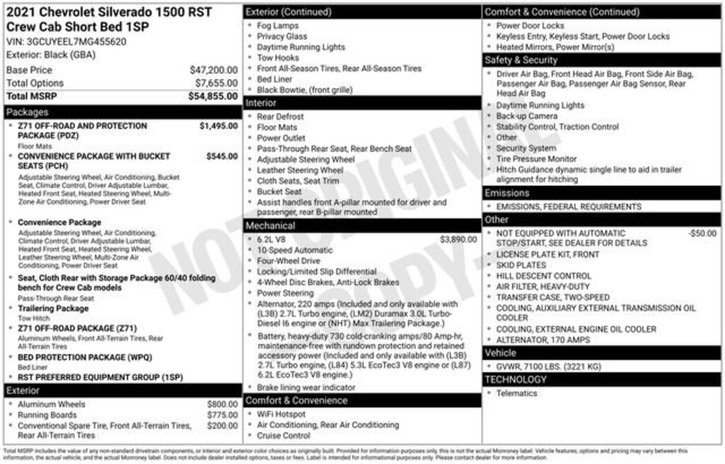 New Price! Black 2021 Chevrolet Silverado 1500 RST 4WD 10-Speed Automatic EcoTec3 6.2L V8 10-Speed Automatic, 4WD, Black Cloth, 10-Way Power Driver Seat w/Lumbar, 12-Volt Rear Auxiliary Power Outlet, 170 Amp Alternator, 2 USB Ports (First Row), 220 Amp Alternator, 3.23 Rear Axle Ratio, 4-Wheel Disc Brakes, 4.2 Diagonal Color Display Driver Info Center, 4 Black Round Assist Steps (LPO), 40/20/40 Front Split-Bench Seat, 4G LTE Wi-Fi Hot Spot Capable, 6 Speakers, 6-Speaker Audio System, ABS brakes, Air Conditioning, All-Star Edition, All-Weather Floor Liner (LPO) (AAK), Alloy wheels, AM/FM radio: SiriusXM, Apple CarPlay/Android Auto, Auto-Locking Rear Differential, Automatic temperature control, Auxiliary External Transmission Oil Cooler, Bed Protection Package, Bluetooth® For Phone, Body Color Grille, Brake assist, Bumpers: body-color, Chevrolet Connected Access Capable, Chevytec Spray-On Black Bedliner, Cloth Rear Seat w/Storage Package, Cloth Seat Trim, Color-Keyed Carpeting Floor Covering, Compass, Convenience Package, Convenience Package w/Buckets Seats, Deep-Tinted Glass, Delay-off headlights, Driver door bin, Driver vanity mirror, Dual Exhaust w/Polished Outlets, Dual front impact airbags, Dual front side impact airbags, Dual-Zone Automatic Climate Control, Electric Rear-Window Defogger, Electrical Lock Control Steering Column, Electronic Cruise Control, Electronic Stability Control, External Engine Oil Cooler, EZ Lift Power Lock & Release Tailgate, Floor Mounted Center Console, Front anti-roll bar, Front Bucket Seats, Front Center Armrest w/Storage, Front dual zone A/C, Front fog lights, Front Frame-Mounted Black Recovery Hooks, Front LED Fog Lamps, Front License Plate Kit, Front reading lights, Front Rubberized Vinyl Floor Mats, Front wheel independent suspension, Fully automatic headlights, Heated door mirrors, Heated Driver & Front Outboard Passenger Seats, Heated front seats, Heated Steering Wheel, Heated steering wheel, Heavy Duty Suspension, Heavy-Duty Air Filter, High Gloss Black Mirror Caps, Hill Descent Control, Hitch Guidance, Illuminated entry, Keyless Open & Start, Leather Wrapped Steering Wheel, LED Cargo Area Lighting, Low tire pressure warning, Manual Tilt/Telescoping Steering Column, Not Equipped w/Automatic Stop/Start, Occupant sensing airbag, Off-Road Suspension, OnStar & Chevrolet Connected Services Capable, Outside temperature display, Overhead airbag, Overhead console, Panic alarm, Passenger door bin, Passenger vanity mirror, Power Door Locks, Power door mirrors, Power driver seat, Power Front Windows w/Driver Express Up/Down, Power Front Windows w/Passenger Express Down, Power Rear Windows w/Express Down, Power steering, Power windows, Preferred Equipment Group 1SP, Premium audio system: Chevrolet Infotainment 3, Radio data system, Radio: Chevrolet Infotainment 3 System, Rear 60/40 Folding Bench Seat (Folds Up), Rear Dual USB Charging-Only Ports, Rear reading lights, Rear Rubberized-Vinyl Floor Mats, Rear seat center armrest, Rear step bumper, Rear Vision Camera, Rear Wheelhouse Liners, Rear window defroster, Remote keyless entry, Remote Vehicle Starter System, Security system, SiriusXM Radio, Speed control, Speed-sensing steering, Split folding rear seat, Standard Tailgate, Steering Wheel Audio Controls, Steering wheel mounted audio controls, Tachometer, Telescoping steering wheel, Theft Deterrent System (Unauthorized Entry), Tilt steering wheel, Traction control, Trailering Package, Trip computer, Variably intermittent wipers, Voltmeter, Wheels: 18 x 8.5 Bright Silver Painted Aluminum, Wheels: 20 x 9 Painted Aluminum, Z71 Off-Road & Protection Package, Z71 Off-Road Package.Recent Arrival! Odometer is 21162 miles below market average!