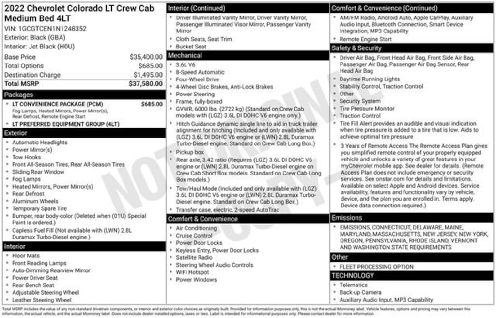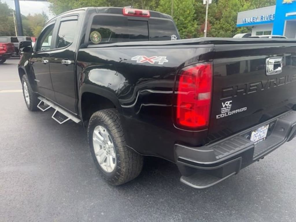 Black 2022 Chevrolet Colorado LT 4WD 8-Speed Automatic V6 4WD, 3.42 Rear Axle Ratio, 4-Wheel Disc Brakes, 6 Speakers, 6-Speaker Audio System Feature, ABS brakes, Air Conditioning, Alloy wheels, AM/FM radio: SiriusXM, Apple CarPlay/Android Auto, Auto-dimming Rear-View mirror, Bumpers: body-color, Cloth Seat Trim, Compass, Delay-off headlights, Driver 6-Way Power Seat Adjuster, Driver door bin, Driver vanity mirror, Dual front impact airbags, Dual front side impact airbags, Electronic Stability Control, Enhanced Driver Instrument Information Display, Exterior Parking Camera Rear, Front anti-roll bar, Front Bucket Seats, Front Center Armrest, Front Fog Lamps, Front reading lights, Front wheel independent suspension, Fully automatic headlights, Illuminated entry, Low tire pressure warning, LT Convenience Package, Manual Rear-Sliding Window, Occupant sensing airbag, Outside Heated Power-Adjustable Body-Color Mirrors, Outside temperature display, Overhead airbag, Overhead console, Panic alarm, Passenger door bin, Passenger vanity mirror, Power door mirrors, Power driver seat, Power steering, Power windows, Preferred Equipment Group 4LT, Premium audio system: Chevrolet Infotainment 3, Radio data system, Radio: Chevrolet Infotainment 3 System, Rear reading lights, Rear seat center armrest, Rear step bumper, Rear Vision Camera, Rear-Window Electric Defogger, Remote keyless entry, Remote Vehicle Starter System, Security system, SiriusXM Radio, Speed control, Speed-sensing steering, Steering wheel mounted audio controls, Tachometer, Telescoping steering wheel, Tilt steering wheel, Traction control, Trip computer, Variably intermittent wipers, Wheels: 17 x 8 Blade Silver Metallic Cast Alloy.