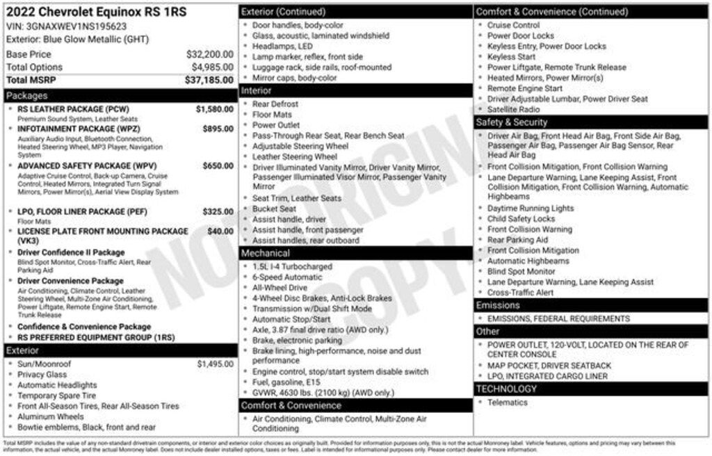 Blue Glow Metallic 2022 Chevrolet Equinox RS AWD 6-Speed Automatic Electronic with Overdrive 1.5L DOHC AWD, 120-Volt Power Outlet, 19 Aluminum Wheels, 2 Rear USB Charging-Only Ports, 2 USB Data Ports, 2 USB Data Ports w/SD Card Reader, 2 USB Ports & Auxiliary Input Jack, 2-Way Power Driver Lumbar Control Seat Adjuster, 3.87 Final Drive Axle Ratio, 4-Wheel Disc Brakes, 6 Speaker Audio System Feature, 6 Speakers, 8-Way Power Driver Seat Adjuster, ABS brakes, Adaptive Cruise Control, Advanced Safety Package, Air Conditioning, All-Weather Floor Liners (LPO), Alloy wheels, AM/FM radio: SiriusXM, Auto High-beam Headlights, Automatic temperature control, Bluetooth® For Phone, Bose Premium 7-Speaker Audio System Feature, Brake assist, Bumpers: body-color, Compass, Delay-off headlights, Driver door bin, Driver Seatback Map Pocket, Driver vanity mirror, Dual front impact airbags, Dual front side impact airbags, Electronic Stability Control, Emergency communication system: OnStar and Chevrolet connected services capable, Floor Liner Package (LPO), Four wheel independent suspension, Front anti-roll bar, Front Bucket Seats, Front Center Armrest, Front dual zone A/C, Front Passenger 4-Way Manual Seat Adjuster, Front reading lights, Fully automatic headlights, HD Surround Vision, Heated door mirrors, Heated Driver & Front Passenger Seats, Heated front seats, Heated Steering Wheel, Illuminated entry, Infotainment Package, Integrated Cargo Liner (LPO), Leather steering wheel, Low tire pressure warning, Occupant sensing airbag, Outside Heated Power Adjustable Mirrors, Outside temperature display, Overhead airbag, Overhead console, Panic alarm, Passenger door bin, Passenger vanity mirror, Perforated Leather-Appointed Seat Trim, Power door mirrors, Power driver seat, Power Liftgate, Power steering, Power Sunroof, Power windows, Preferred Equipment Group 1RS, Premium audio system: Chevrolet Infotainment 3, Premium Cloth Seat Trim, Radio data system, Radio: Chevrolet Infotainment 3 Plus System w/Navi, Radio: Chevrolet Infotainment 3 System w/AM/FM, Rear anti-roll bar, Rear reading lights, Rear seat center armrest, Rear window defroster, Rear window wiper, Remote keyless entry, Roof rack: rails only, RS Leather Package, Security system, SiriusXM Radio, Speed control, Speed-sensing steering, Split folding rear seat, Spoiler, Steering wheel mounted audio controls, Tachometer, Telescoping steering wheel, Tilt steering wheel, Traction control, Trip computer, Variably intermittent wipers, Wireless Apple CarPlay/Wireless Android Auto.Recent Arrival! 25/30 City/Highway MPG
