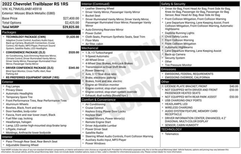 Mosaic Black Metallic 2022 Chevrolet TrailBlazer RS AWD 9-Speed Automatic 1.3L Ecotec Turbo DOHC SIDI w/VVT 1 Type-A & 1 Type-C USB Charging-Only Ports, 120-Volt Power Outlet, 2-Way Power Driver Lumbar Seat Adjuster, 3.17 Axle Ratio, 4-Way Manual Front Passenger Seat Adjuster, 4-Wheel Disc Brakes, 4.2 Diagonal Multi-Color Driver Info Center, 6 Speakers, 6-Speaker Audio System Feature w/Amplifier, 8-Way Power Driver Seat Adjuster, 8 Diagonal Color Touchscreen Display, ABS brakes, Adaptive Cruise Control, Air Conditioning, Alloy wheels, AM/FM radio: SiriusXM, Auto High-beam Headlights, Bose Premium 7-Speaker Audio System Feature, Brake assist, Bumpers: body-color, Cabin Humidity Sensor, Cloth w/Leatherette Seat Trim, Compass, Convenience Package, Delay-off headlights, Driver & Front Passenger Illuminated Vanity Mirrors, Driver Confidence Package, Driver door bin, Driver vanity mirror, Dual front impact airbags, Dual front side impact airbags, Electronic Stability Control, Emergency communication system: OnStar and Chevrolet connected services capable, Exterior Parking Camera Rear, Flat-Folding Front Passenger Seatback, Front anti-roll bar, Front Bucket Seats, Front Center Armrest, Front fog lights, Front License Plate Bracket, Front reading lights, Front wheel independent suspension, Fully automatic headlights, HD Radio, HD Rear Vision Camera, Heated door mirrors, Heated Driver & Front Passenger Seats, Heated front seats, Heated Steering Wheel, Heated steering wheel, Illuminated entry, Inside Rear-View Auto-Dimming Mirror, Knee airbag, Lane Change Alert w/Side Blind Zone Alert, Leather Shift Knob, Leather steering wheel, LED Headlamps, Low tire pressure warning, Memory Card Receptacle, Mosaic Black Metallic Roof, Not Equipped w/Rear Park Assist, Occupant sensing airbag, Overhead airbag, Overhead console, Panic alarm, Passenger door bin, Passenger vanity mirror, Power door mirrors, Power driver seat, Power steering, Power windows, Preferred Equipment Group 1RS, Radio data system, Radio: Chevrolet Infotainment 3 Plus System, Radio: Chevrolet Infotainment 3 System, Rear Cross Traffic Alert, Rear Park Assist, Rear seat center armrest, Rear side impact airbag, Rear window defroster, Rear window wiper, Remote keyless entry, Ride & Handling Suspension, Roof rack: rails only, Security system, Single-Zone Auto Climate Control Air Conditioning, SiriusXM Radio, SiriusXM w/360L, Speed control, Split folding rear seat, Spoiler, Steering wheel mounted audio controls, Tachometer, Technology Package, Telescoping steering wheel, Tilt steering wheel, Traction control, Trip computer, Variably intermittent wipers, Wheels: 18 High Gloss Black Machined Aluminum, Wireless Apple CarPlay/Android Auto, Wireless Charging.