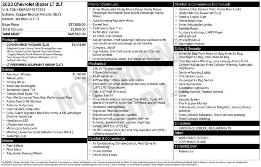 Copper Bronze Metallic 2023 Chevrolet Blazer LT AWD 9-Speed Automatic with Overdrive 2.0L Turbocharged AWD, 170 Amp Alternator, 3.47 Final Drive Axle Ratio, 4-Way Manual Front Passenger Seat Adjuster, 4-Wheel Disc Brakes, 6 Speakers, 6-Speaker Audio System Feature, 8-Way Power Driver Seat Adjuster, ABS brakes, Adaptive Cruise Control, Air Conditioning, Alloy wheels, AM/FM radio: SiriusXM with 360L, Apple CarPlay/Android Auto, Auto High-beam Headlights, Automatic temperature control, Black Lug Nut & Wheel Lock Kit (LPO), Black Roof-Mounted Side Rails, Brake assist, Bumpers: body-color, Child-Seat-Sensing Airbag, Compass, Convenience Package, Delay-off headlights, Driver door bin, Driver vanity mirror, Dual front impact airbags, Dual front side impact airbags, Electronic Stability Control, Emergency communication system: OnStar and Chevrolet connected services capable, Enhanced Automatic Emergency Braking, Four wheel independent suspension, Front anti-roll bar, Front Bucket Seats, Front Center Armrest, Front dual zone A/C, Front reading lights, Fully automatic headlights, Heated door mirrors, Heated Driver & Front Passenger Seats, Illuminated entry, Inside Rear-View Auto-Dimming Mirror, Knee airbag, Leather Shift Knob, Low tire pressure warning, Occupant sensing airbag, Outside temperature display, Overhead airbag, Overhead console, Panic alarm, Passenger door bin, Passenger vanity mirror, Power door mirrors, Power Driver Lumbar Control, Power driver seat, Power steering, Power windows, Preferred Equipment Group 2LT, Premium audio system: Chevrolet Infotainment 3 Plus, Premium Cloth Seat Trim, Radio data system, Radio: Chevrolet Infotainment 3 Plus System, Rear anti-roll bar, Rear Power Programmable Liftgate, Rear reading lights, Rear seat center armrest, Rear window defroster, Rear window wiper, Remote keyless entry, Ride & Handling Suspension, Security system, SiriusXM w/360L, Speed control, Speed-sensing steering, Split folding rear seat, Spoiler, Steering wheel mounted audio controls, Tachometer, Telescoping steering wheel, Tilt steering wheel, Traction control, Trip computer, Universal Home Remote, Variably intermittent wipers, Voltmeter, Wheels: 18 Grazen Metallic Aluminum, Wheels: 20 Gloss Black Aluminum, Wireless Charging.