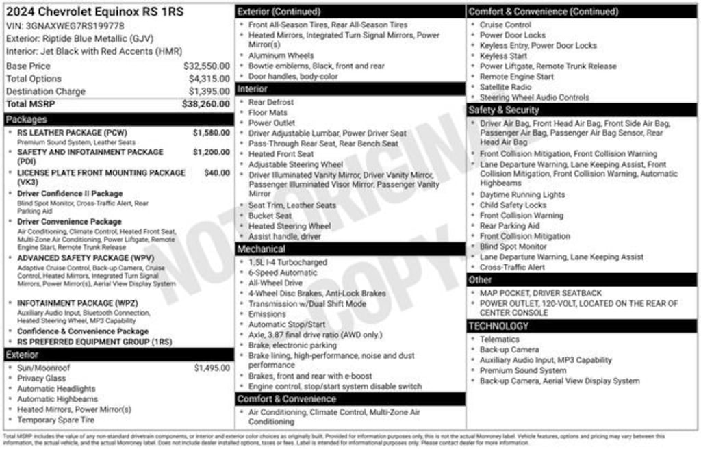 Riptide Blue Metallic 2024 Chevrolet Equinox RS AWD 6-Speed Automatic Electronic with Overdrive 1.5L DOHC AWD, 120-Volt Power Outlet, 19 Aluminum Wheels, 2 Rear USB Charging-Only Ports, 2 USB Data Ports, 2 USB Data Ports w/SD Card Reader, 2 USB Ports & Auxiliary Input Jack, 2-Way Power Driver Lumbar Control Seat Adjuster, 3.87 Final Drive Axle Ratio, 4-Wheel Disc Brakes, 6 Speakers, 6-Speaker Audio System Feature, ABS brakes, Adaptive Cruise Control, Advanced Safety Package, Air Conditioning, Alloy wheels, AM/FM radio: SiriusXM, Auto High-beam Headlights, Automatic temperature control, Bluetooth® For Phone, Bose Premium 7-Speaker Audio System Feature, Brake assist, Bumpers: body-color, Compass, Delay-off headlights, Driver 8-Way Power Seat Adjuster, Driver door bin, Driver Seatback Map Pocket, Driver vanity mirror, Dual front impact airbags, Dual front side impact airbags, Electronic Stability Control, Emergency communication system: OnStar and Chevrolet connected services capable, Four wheel independent suspension, Front anti-roll bar, Front Bucket Seats, Front Center Armrest, Front dual zone A/C, Front Passenger 4-Way Manual Seat Adjuster, Front reading lights, Fully automatic headlights, HD Surround Vision, Heated door mirrors, Heated Driver & Front Passenger Seats, Heated front seats, Heated Steering Wheel, Illuminated entry, Infotainment Package, Low tire pressure warning, Occupant sensing airbag, Outside Heated Power-Adjustable Mirrors, Outside temperature display, Overhead airbag, Overhead console, Panic alarm, Passenger door bin, Passenger vanity mirror, Perforated Leather-Appointed Seat Trim, Power door mirrors, Power driver seat, Power Liftgate, Power steering, Power Sunroof, Power windows, Preferred Equipment Group 1RS, Premium audio system: Chevrolet Infotainment 3, Premium Cloth Seat Trim, Radio data system, Radio: Chevrolet Infotainment 3 Plus System, Radio: Chevrolet Infotainment 3 System w/AM/FM, Rear anti-roll bar, Rear reading lights, Rear seat center armrest, Rear window defroster, Rear window wiper, Remote keyless entry, Roof rack: rails only, RS Leather Package, Safety & Infotainment Package, Security system, SiriusXM, Speed control, Speed-sensing steering, Split folding rear seat, Spoiler, Steering wheel mounted audio controls, Tachometer, Telescoping steering wheel, Tilt steering wheel, Traction control, Trip computer, Variably intermittent wipers.Recent Arrival! 24/30 City/Highway MPG