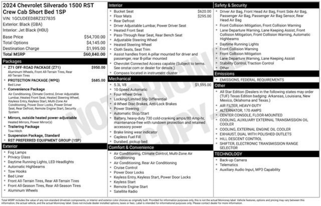 Black 2024 Chevrolet Silverado 1500 RST 4WD 10-Speed Automatic EcoTec3 5.3L V8 10-Speed Automatic, 4WD, Black Cloth, 10-Way Power Driver Seat w/Lumbar, 12.3 Multicolor Reconfigurable Digital Display, 120-Volt Bed Mounted Power Outlet, 120-Volt Interior Power Outlet, 170 Amp Alternator, 2 USB Data Ports, 220 Amp Alternator, 3.23 Rear Axle Ratio, 4-Wheel Disc Brakes, 40/20/40 Front Split-Bench Seat, 6 Speakers, 6-Speaker Audio System, ABS brakes, Air Conditioning, All-Star Edition, All-Weather Floor Liner (LPO) (AAK), Alloy wheels, AM/FM radio: SiriusXM with 360L, Auto High-beam Headlights, Auto-Locking Rear Differential, Automatic Emergency Braking, Automatic temperature control, Auxiliary External Transmission Oil Cooler, Bluetooth® For Phone, Brake assist, Bumpers: body-color, Chevrolet Connected Access Capable, Chevytec Spray-On Black Bedliner, Cloth Seat Trim, Color-Keyed Carpeting Floor Covering, Compass, Convenience Package, Deep-Tinted Glass, Delay-off headlights, Driver door bin, Driver vanity mirror, Dual Exhaust w/Polished Outlets, Dual front impact airbags, Dual front side impact airbags, Dual Rear USB Ports (Charge Only), Dual-Zone Automatic Climate Control, Electric Rear-Window Defogger, Electrical Steering Column Lock, Electronic Cruise Control, Electronic Stability Control, Electronic Transmission Range Selector Shifter, External Engine Oil Cooler, EZ Lift Power Lock & Release Tailgate, Floor Mounted Center Console, Following Distance Indicator, Forward Collision Alert, Front anti-roll bar, Front Bucket Seats, Front Center Armrest w/Storage, Front dual zone A/C, Front fog lights, Front Frame-Mounted Black Recovery Hooks, Front LED Fog Lamps, Front Pedestrian Braking, Front reading lights, Front Rubberized Vinyl Floor Mats, Front wheel independent suspension, Fully automatic headlights, HD Rear Vision Camera, Heated door mirrors, Heated Driver & Front Outboard Passenger Seats, Heated front seats, Heated Power-Adjustable Outside Mirrors, Heated Steering Wheel, Heated steering wheel, Heavy-Duty Air Filter, High Gloss Black Mirror Caps, Hill Descent Control, Hitch Guidance, Illuminated entry, Inside Rear-View Mirror w/Tilt, IntelliBeam Automatic High Beam On/Off, Keyless Open & Start, Lane Keep Assist w/Lane Departure Warning, LED Cargo Area Lighting, Low tire pressure warning, Occupant sensing airbag, Off-Road Suspension, OnStar & Chevrolet Connected Services Capable, Outside temperature display, Overhead airbag, Overhead console, Panic alarm, Passenger door bin, Passenger vanity mirror, Power door mirrors, Power driver seat, Power Front Windows w/Driver Express Up/Down, Power Front Windows w/Passenger Express Down, Power Rear Windows w/Express Down, Power steering, Power windows, Preferred Equipment Group 1SP, Premium audio system: Chevrolet Infotainment 3 Premium, Protection Package, Radio data system, Radio: Chevrolet Infotainment 3 Premium System, Rear 60/40 Folding Bench Seat (Folds Up), Rear reading lights, Rear Rubberized-Vinyl Floor Mats, Rear step bumper, Rear Wheelhouse Liners, Rear window defroster, Remote keyless entry, Remote Vehicle Starter System, Security system, Single Outlet Exhaust, SiriusXM w/360L, Speed control, Speed-sensing steering, Split folding rear seat, Standard Suspension Package, Standard Tailgate, Steering Wheel Audio Controls, Steering wheel mounted audio controls, Tachometer, Telescoping steering wheel, Theft Deterrent System (Unauthorized Entry), Tilt steering wheel, Traction control, Trailering Package, Trip computer, Variably intermittent wipers, Voltmeter, Wheels: 18 x 8.5 Bright Silver Painted Aluminum, Wi-Fi Hot Spot Capable, Wireless Charging, Wrapped Steering Wheel, Z71 Off-Road Package.