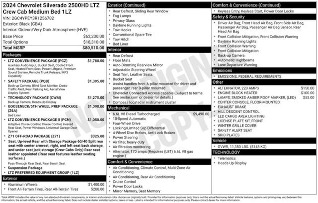 Black 2024 Chevrolet Silverado 2500HD LTZ 4WD 10-Speed Automatic Duramax 6.6L V8 Turbodiesel 10-Speed Automatic, 4WD, Gideon/Very Dark Atmosphere Leather, 10-Way Power Driver Seat Adjuster w/Lumbar, 10-Way Power Passenger Seat Adjuster w/Lumbar, 120-Volt Bed Mounted Power Outlet, 120-Volt Interior Power Outlet, 15 Diagonal Multicolor Head-Up Display, 170 Amp Alternator, 2 Charge/Data USB Ports Inside Center Console, 220 Amp Alternator, 4-Wheel Disc Brakes, 6 Speakers, 6-Speaker Audio System, 720 Cold-Cranking Amps Heavy-Duty Battery, ABS brakes, Adaptive Cruise Control, Air Conditioning, Alloy wheels, AM/FM radio: SiriusXM with 360L, Apple CarPlay/Android Auto, Auto High-beam Headlights, Auto-dimming door mirrors, Auto-Dimming Inside Rear-View Mirror, Auto-dimming Rear-View mirror, Automatic temperature control, Bed View Camera w/2 Trailer Camera Provisions, Black Chevytec Spray-On Bedliner, Bluetooth® For Phone, BOSE Premium 7-Speaker Sound System, Brake assist, Bumpers: chrome, Chevrolet Connected Access Capable, Chrome Door Handles, Chrome Mirror Caps, Color-Keyed Carpeting Floor Covering, Compass, Deep-Tinted Glass, Delay-off headlights, Driver door bin, Driver Memory, Driver vanity mirror, Dual front impact airbags, Dual front side impact airbags, Durabed Pickup Bed, Electric Rear-Window Defogger, Electronic Cruise Control w/Set & Resume Speed, Electronic Stability Control, Engine Block Heater, Exhaust Brake, EZ Lift Power Lock & Release Tailgate, Floor-Mounted Center Console, Front 40/20/40 Split-Bench Seats w/Lockable Storage, Front anti-roll bar, Front Bucket Seats, Front Center Armrest w/Storage, Front dual zone A/C, Front fog lights, Front LED Fog Lamps, Front License Plate Kit, Front Rain-Sensing Wipers, Front reading lights, Front Rubberized Vinyl Floor Mats, Front wheel independent suspension, Fully automatic headlights, Gooseneck/5th Wheel Prep Package, HD Rear Vision Camera, HD Surround Vision, Heated 2nd Row Outboard Seats, Heated door mirrors, Heated Driver & Front Outboard Passenger Seating, Heated front seats, Heated Steering Wheel, Heated steering wheel, Hill Descent Control, Hitch Guidance w/Hitch View, Illuminated entry, In-Vehicle Trailering App System, Keyless Open & Start, LED Cargo Area Lighting, LED Smoked Amber Roof Marker Lamps, Low tire pressure warning, LTZ Convenience Package, LTZ Convenience Package II, Manual Tilt & Telescoping Steering Column, Memory seat, Occupant sensing airbag, Off-Road Suspension, OnStar & Chevrolet Connected Services Capable, Outside temperature display, Overhead airbag, Overhead console, Panic alarm, Passenger door bin, Passenger vanity mirror, Perf Leather-Appointed Front Outboard Seat Trim, Power Door Locks, Power door mirrors, Power driver seat, Power Front Windows w/Driver Express Up/Down, Power Front Windows w/Passenger Express Up/Down, Power passenger seat, Power Rear Windows w/Express Down, Power Sliding Rear Window w/Defogger, Power steering, Power windows, Preferred Equipment Group 1LZ, Premium audio system: Chevrolet Infotainment 3 Premium, Push Button Start, Pwr Up/Down Tailgate Function w/Pwr Lock & Release, Radio: Chevrolet Infotainment 3 Premium System, Rain sensing wipers, Rear Camera Mirror, Rear Cross Traffic Alert, Rear reading lights, Rear Rubberized Vinyl Floor Mats, Rear seat center armrest, Rear step bumper, Rear Wheelhouse Liners, Rear window defroster, Remote keyless entry, Remote Vehicle Starter System, Safety Alert Seat, Safety Package, Security system, SiriusXM w/360L, Speed control, Speed-sensing steering, Split folding rear seat, Standard Tailgate, Steering Wheel Audio Controls, Steering wheel mounted audio controls, Suspension Package, Tachometer, Technology Package, Telescoping steering wheel, Tilt steering wheel, Traction control, Trailer Camera Provisions, Trailer Side Blind Zone Alert, Trip computer, Turn signal indicator mirrors, Ultrasonic Front & Rear Park Assist, Unauthorized Entry T