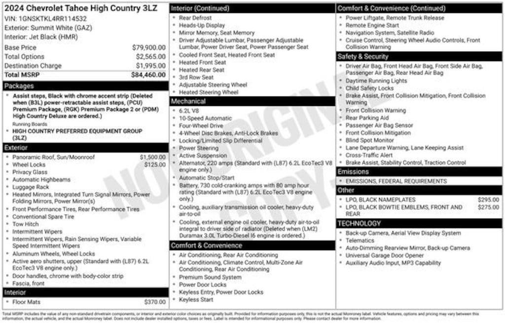 Summit White 2024 Chevrolet Tahoe High Country 4WD 10-Speed Automatic with Overdrive EcoTec3 6.2L V8 4WD, Jet Black Leather, 10 Speakers, 12-Way Power Driver & Passenger Seat Adjusters, 15 Diagonal Multi-Color Head-Up Display, 1st & 2nd Row Color-Keyed Carpeted Floor Mats, 1st, 2nd & 3rd Rows All-Weather Floor Liners (LPO), 2-Speed Active Electronic AutoTrac Transfer Case, 3.23 Rear Axle Ratio, 3rd Row 60/40 Power-Folding Split-Bench Seat, 3rd row seats: split-bench, 4-Wheel Disc Brakes, ABS brakes, Adaptive Cruise Control, Adaptive suspension, Air Conditioning, Alloy wheels, AM/FM radio: SiriusXM with 360L, Apple CarPlay/Android Auto, Auto High-beam Headlights, Auto-dimming door mirrors, Auto-dimming Rear-View mirror, Auto-leveling suspension, Automatic temperature control, Black Name Plates (LPO), Bose 10-Speaker Centerpoint Surround Audio Sys Ft, Brake assist, Bright Front & Rear Door Sill Plates, Bumpers: body-color, Chrome Door Handles w/Body-Color Strip, Color-Keyed Carpeting Floor Covering, Compass, Delay-off headlights, Driver & Front Outboard Passenger Airbags, Driver & Front Passenger Heated & Ventilated Seats, Driver door bin, Driver vanity mirror, Dual Exhaust System, Dual front impact airbags, Dual front side impact airbags, Dual-Pane Power Panoramic Sunroof, Electronic Stability Control, Emergency communication system: OnStar and Chevrolet connected services capable, Enhanced Automatic Emergency Braking, Enhanced Driver Information Center, Exterior Parking Camera Rear, Floor Console, Four wheel independent suspension, Front & Rear Black Bowtie Emblems (LPO), Front anti-roll bar, Front Bucket Seats, Front Center Armrest, Front dual zone A/C, Front High-Back Reclining Bucket Seats, Front reading lights, Fully automatic headlights, Garage door transmitter, Hands-Free Rear Power Programmable Liftgate, HD Surround Vision, Heads-Up Display, Heated 2nd Row Outboard Seats, Heated door mirrors, Heated Driver & Front Passenger Seats, Heated front seats, Heated rear seats, Heated Steering Wheel, Heated steering wheel, Hill Descent Control, Illuminated entry, Infotainment Display, Inside Rearview Auto-Dimming Rear Camera Mirror, Lane Change Alert w/Side Blind Zone Alert, LED Daytime Running Lamps, Low tire pressure warning, Magnetic Ride Control Suspension, Memory seat, Memory Settings, Navigation System, Occupant sensing airbag, Outside Heated Power-Adjustable Mirrors, Outside temperature display, Overhead airbag, Overhead console, Panic alarm, Passenger door bin, Passenger vanity mirror, Perforated Leather Seat Trim, Power door mirrors, Power driver seat, Power Liftgate, Power passenger seat, Power Release 2nd Row Bucket Seats, Power steering, Power Tilt & Telescopic Steering Column, Power windows, Preferred Equipment Group 3LZ, Premium audio system: Chevrolet Infotainment 3 Premium, Radio: Chevrolet Infotainment 3 Premium System, Rain sensing wipers, Rear air conditioning, Rear anti-roll bar, Rear Camera Mirror Washer, Rear Cross Traffic Alert, Rear Pedestrian Alert, Rear reading lights, Rear window defroster, Rear window wiper, Remote keyless entry, Remote Start, Roof rack: xxxxxx, Safety Alert Seat, Security system, Set of 4 Wheel Locks (LPO), SiriusXM w/360L, Speed control, Speed-sensing steering, Split folding rear seat, Spoiler, Steering wheel memory, Steering wheel mounted audio controls, Tachometer, Telescoping steering wheel, Tilt steering wheel, Traction control, Trip computer, Turn signal indicator mirrors, Universal Home Remote, Variably intermittent wipers, Ventilated front seats, Voltmeter, Wheels: 22 x 9 Sterling Silver Premium Painted, Wireless Charging, Wrapped Steering Wheel.