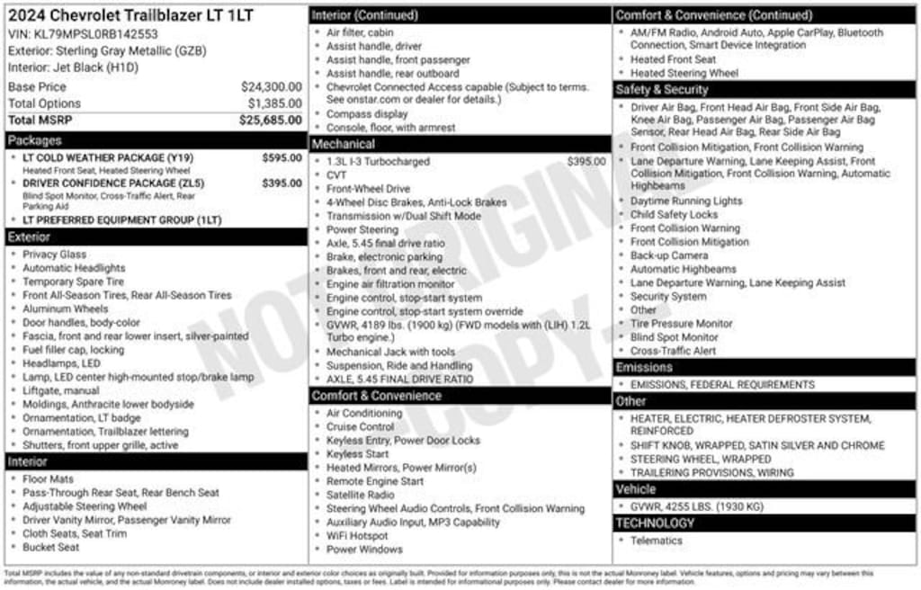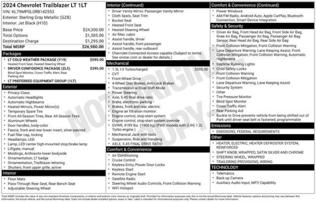 Sterling Gray Metallic 2024 Chevrolet TrailBlazer LT FWD CVT 1.3L Ecotec Turbo DOHC SIDI w/VVT 1 Type-A & 1 Type-C USB Ports, 11 Diagonal HD Color Touchscreen, 4-Way Manual Front Passenger Seat Adjuster, 4-Wheel Disc Brakes, 5.45 Final Drive Axle Ratio, 6 Speakers, 6-Speaker Audio System Feature, 6-Way Manual Driver Seat Adjuster, ABS brakes, Air Conditioning, Alloy wheels, AM/FM radio: SiriusXM, Auto High-beam Headlights, Brake assist, Bumpers: body-color, Chevrolet Connected Access Capable, Cloth Seat Trim, Compass, Delay-off headlights, Driver Confidence Package, Driver door bin, Driver vanity mirror, Dual front impact airbags, Dual front side impact airbags, Electronic Stability Control, Emergency communication system: OnStar and Chevrolet connected services capable, Exterior Parking Camera Rear, Flat-Folding Front Passenger Seatback, Front anti-roll bar, Front Bucket Seats, Front Center Armrest, Front reading lights, Front wheel independent suspension, Fully automatic headlights, Heated door mirrors, Heated Driver & Front Passenger Seats, Heated Steering Wheel, Illuminated entry, Knee airbag, Lane Change Alert w/Side Blind Zone Alert, Low tire pressure warning, LT Cold Weather Package, Occupant sensing airbag, Overhead airbag, Overhead console, Panic alarm, Passenger door bin, Passenger vanity mirror, Power door mirrors, Power steering, Power windows, Preferred Equipment Group 1LT, Radio data system, Radio: AM/FM Stereo Audio System, Rear Cross Traffic Alert, Rear Park Assist, Rear side impact airbag, Rear window defroster, Rear window wiper, Reinforced Electric Heater/Defroster System, Remote keyless entry, Ride & Handling Suspension, Satin Silver & Chrome Wrapped Shift Knob, Security system, SiriusXM, Speed control, Split folding rear seat, Spoiler, Steering wheel mounted audio controls, Tachometer, Telescoping steering wheel, Tilt steering wheel, Traction control, Trip computer, Variably intermittent wipers, Wheels: 17 High Gloss Black Machined Aluminum, Wireless Apple CarPlay/Android Auto, Wrapped Steering Wheel.