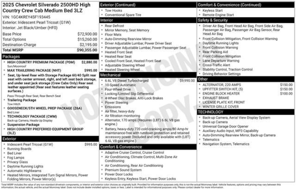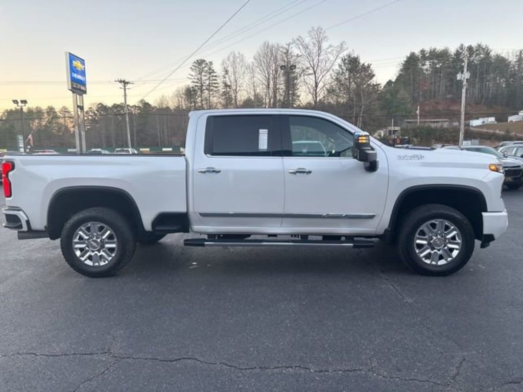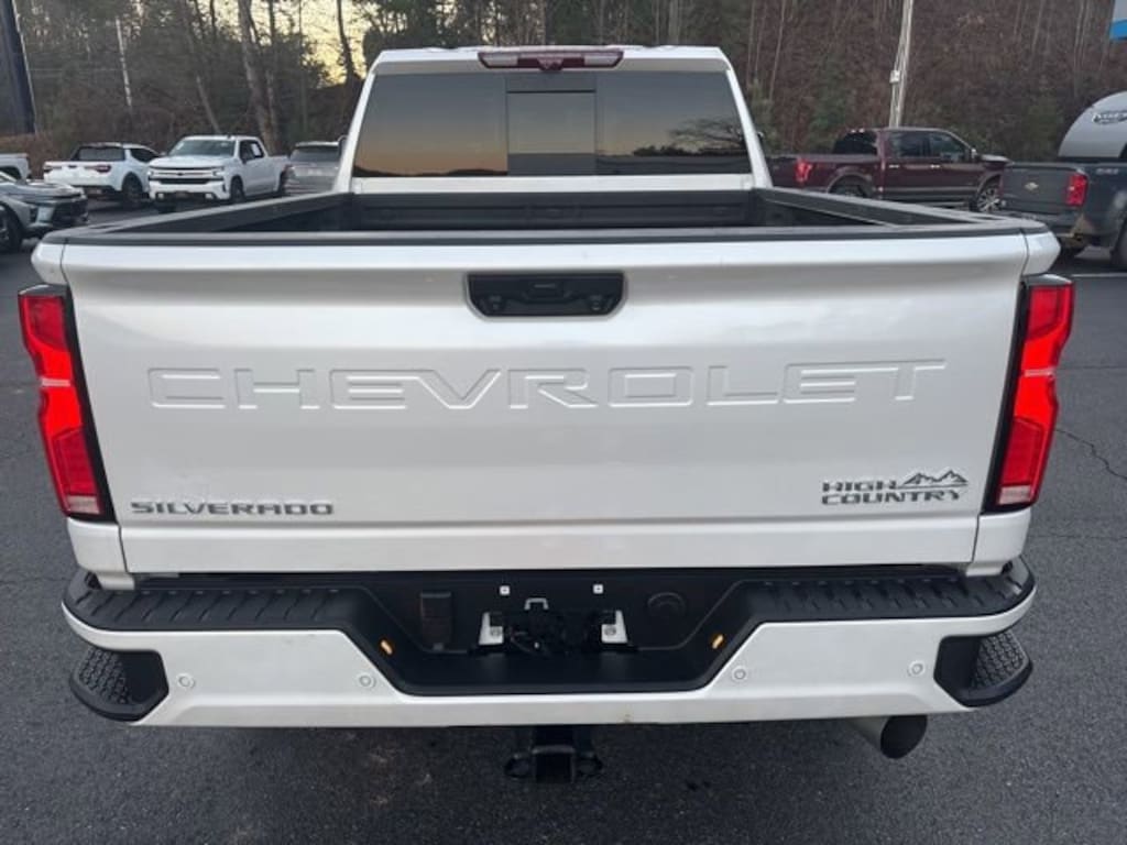 Iridescent Pearl Tricoat 2025 Chevrolet Silverado 2500HD High Country 4WD 10-Speed Automatic Duramax 6.6L V8 Turbodiesel 10-Speed Automatic, 4WD, Jet Black/Umber Leather, 10-Way Power Driver Seat Adjuster with Lumbar, 10-Way Power Passenger Seat Adjuster with Lumbar, 120-Volt Bed Mounted Power Outlet, 120-Volt Interior Power Outlet, 15 Diagonal Multicolor Head-Up Display, 170 Amp Alternator, 220 Amp Alternator, 3.73 Rear Axle Ratio, 4-Wheel Disc Brakes, 6 Rectangular Chromed Tubular Assist Steps, 7 Speakers, 720 Cold-Cranking Amps Heavy-Duty Battery, ABS brakes, Air Conditioning, Alloy wheels, AM/FM radio: SiriusXM with 360L, Apple CarPlay/Android Auto, Auto High-beam Headlights, Auto-dimming door mirrors, Auto-Dimming Inside Rear-View Mirror, Auto-dimming Rear-View mirror, Automatic temperature control, Bed View Camera with Two Trailer Camera Provisions, Black Chevytec Spray-on Bedliner, Bluetooth® For Phone, Bodyside moldings, BOSE Premium 7-Speaker Sound System, Brake assist, Bumpers: body-color, Chevrolet Connected Access Capable, Chrome Door Handles, Chrome Mirror Caps, Color-Keyed Carpeting Floor Covering, Compass, Deep-Tinted Glass, Delay-off headlights, Driver door bin, Driver Memory, Driver vanity mirror, Dual front impact airbags, Dual front side impact airbags, Durabed Pickup Bed, Electric Rear-Window Defogger, Electronic Stability Control, Emergency communication system: OnStar, Engine Block Heater, Exhaust Brake, Floor-Mounted Center Console, Front anti-roll bar, Front Bucket Seats, Front Carpeted Floor Mats, Front Center Armrest, Front Chrome Recovery Hooks, Front dual zone A/C, Front fog lights, Front LED Fog Lamps, Front License Plate Kit, Front Rain-Sensing Wipers, Front reading lights, Front wheel independent suspension, Fully automatic headlights, Garage door transmitter, Genuine wood console insert, Genuine wood dashboard insert, Genuine wood door panel insert, Gooseneck/5th Wheel Prep Package, Heated 2nd Row Outboard Seats, Heated door mirrors, Heated Driver and Front Outboard Passenger Seating, Heated front seats, Heated rear seats, Heated Steering Wheel, Heated steering wheel, High Country Premium Package, Hitch Guidance with Hitch View, Illuminated entry, in-Vehicle Trailering App System, Keyless Open and Start, LED Cargo Area Lighting, Low tire pressure warning, Manual Tilt and Telescoping Steering Column, Max Trailering Package, Memory seat, Occupant sensing airbag, OnStar Services Capable, Outside temperature display, Overhead airbag, Overhead console, Panic alarm, Passenger door bin, Passenger vanity mirror, Perforated Leather Seat Trim, Polished Exhaust Tip, Power Door Locks, Power door mirrors, Power driver seat, Power Front Windows with Driver Express Up/Down, Power Front Windows with Passenger Express Up/Down, Power passenger seat, Power Rear Windows with Express Down, Power Sliding Rear Window with Defogger, Power steering, Power Sunroof, Power Up/Down Tailgate Function with Power Lock and Release, Power windows, Preferred Equipment Group 3LZ, Premium audio system: Chevrolet Infotainment 3 Premium, Push Button Start, Radio: Chevrolet Infotainment 3 Premium System, Rain sensing wipers, Rear Camera Mirror, Rear Carpeted Floor Mats, Rear Cross Traffic Alert, Rear reading lights, Rear seat center armrest, Rear step bumper, Rear Wheelhouse Liners, Rear window defroster, Remote keyless entry, Remote Vehicle Starter System, Security system, SiriusXM with 360L Trial Subscription, Speed control, Speed-sensing steering, Split folding rear seat, Standard Tailgate, Steering Wheel Audio Controls, Steering wheel mounted audio controls, Suspension Package, Tachometer, Technology Package, Telescoping steering wheel, Tilt steering wheel, Traction control, Trailer Camera Provisions, Trip computer, Turn signal indicator mirrors, Ultrasonic Front and Rear Park Assist, Unauthorized Entry Theft-Deterrent System, Universal Home Remote, Up-Level Rear Seat with Storage