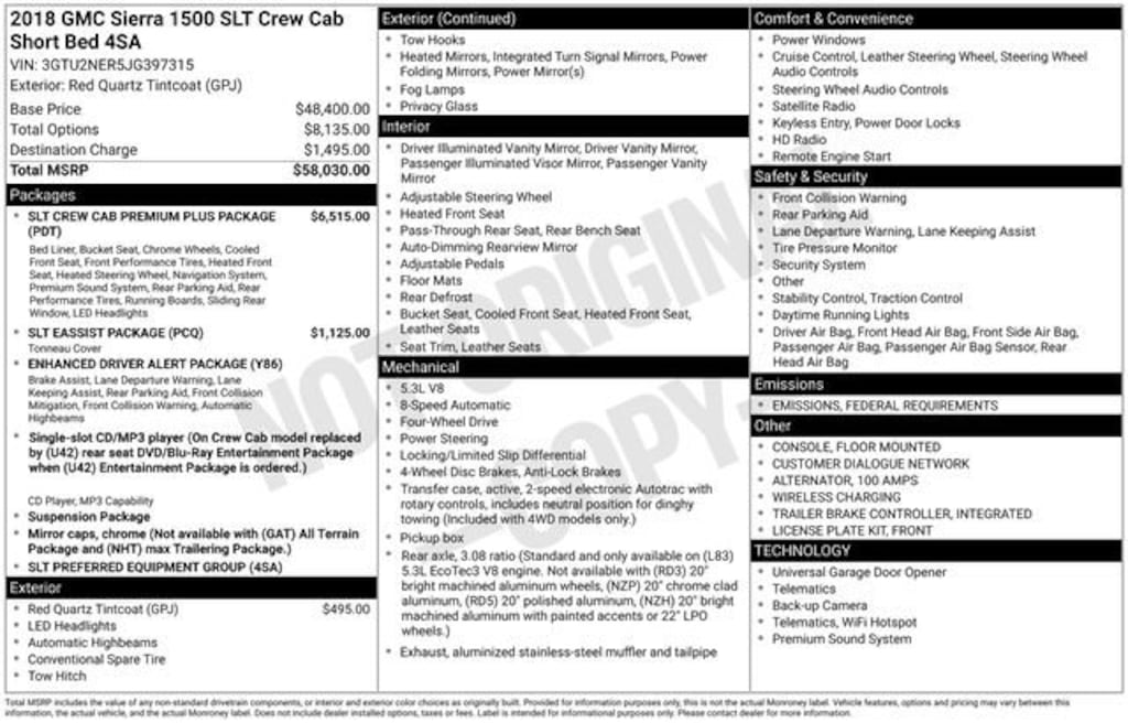 Red Quartz Tintcoat 2018 GMC Sierra 1500 SLT 4WD 8-Speed Automatic EcoTec3 5.3L V8 8-Speed Automatic, 4WD, Cocoa/Dune Leather, 10-Way Power Driver's Seat Adjuster, 100 Amps Alternator, 110-Volt AC Power Outlet, 150 Amp Alternator, 1st & 2nd Row Color-Keyed Carpeted Floor Mats, 2-Speed Active Electronic AutoTrac Transfer Case, 20 x 9 Chrome Clad Aluminum Wheels, 3.42 Rear Axle Ratio, 4-Wheel Disc Brakes, 4.2 Diagonal Color Display Driver Info Center, 40/20/40 Front Split Bench Seat, 6 Speakers, 6-Speaker Audio System, 6 Rectangular Chromed Tubular Assist Steps, ABS brakes, Adjustable pedals, Air Conditioning, Alloy wheels, AM/FM radio: SiriusXM, Auto-dimming door mirrors, Auto-Dimming Inside Rear-View Mirror, Auto-dimming Rear-View mirror, Automatic temperature control, Auxiliary External Transmission Oil Cooler, Bodyside moldings, Bose Speaker System, Brake assist, Bumpers: chrome, CD player, Chrome Bodyside Moldings, Chrome Door Handles, Chrome Mirror Caps, Color-Keyed Carpeting, Compass, Deep-Tinted Glass, Delay-off headlights, Driver & Front Passenger Illuminated Vanity Mirrors, Driver door bin, Driver vanity mirror, Dual front impact airbags, Dual front side impact airbags, Dual-Zone Automatic Climate Control, Electric Rear-Window Defogger, Electronic Stability Control, Enhanced Driver Alert Package, Exterior Parking Camera Rear, EZ Lift & Lower Tailgate, Floor Mounted Console, Forward Collision Alert, Front anti-roll bar, Front Center Armrest w/Storage, Front dual zone A/C, Front fog lights, Front Frame-Mounted Black Recovery Hooks, Front Full Feature Power Reclining Bucket Seats, Front License Plate Kit, Front reading lights, Front wheel independent suspension, Fully automatic headlights, Garage door transmitter, GMC 4G LTE, GMC Connected Access, HD Radio, Heated & Ventilated Front Bucket Seats, Heated door mirrors, Heated Driver & Front Passenger Seats, Heated front seats, Heavy Duty Suspension, Heavy-Duty Rear Locking Differential, High-Intensity Discharge Headlights, High-Performance LED Headlamps, Illuminated entry, Integrated Trailer Brake Controller, IntelliBeam Automatic High Beam On/Off Headlight, Lane Keep Assist, Leather Appointed Seat Trim, Leather Wrapped Heated Steering Wheel, Leather Wrapped Steering Wheel w/Cruise Controls, LED Cargo Box Lighting, LED Tailamps w/Signature, Low Speed Forward Automatic Braking, Low tire pressure warning, Manual Tilt/Telescoping Steering Column, Memory seat, Occupant sensing airbag, OnStar & GMC Connected Services Capable, Outside temperature display, Overhead airbag, Overhead console, Panic alarm, Passenger door bin, Passenger vanity mirror, Power Adjustable Pedals, Power door mirrors, Power driver seat, Power Folding & Adjustable Heated Outside Mirrors, Power passenger seat, Power Sliding Rear Window w/Defogger, Power steering, Power windows, Power Windows w/Driver Express Up & Down, Preferred Equipment Group 4SA, Premium audio system: GMC Infotainment System, Radio data system, Radio: AM/FM/GMC Infotainment & Navigation, Radio: AM/FM/GMC Infotainment System, Rear 60/40 Folding Bench Seat (Folds Up), Rear reading lights, Rear seat center armrest, Rear step bumper, Rear Wheelhouse Liners, Rear window defroster, Remote Keyless Entry, Remote keyless entry, Remote Locking Tailgate, Remote Vehicle Starter System, Security system, Single Slot CD/MP3 Player, SiriusXM Satellite Radio, SLT Crew Cab Premium Plus Package, SLT eAssist Package, Soft Folding Tonneau Cover (LPO), Speed control, Speed-sensing steering, Split folding rear seat, Spray-On Pickup Box Bed Liner w/GMC Logo, Steering Wheel Audio Controls, Steering wheel mounted audio controls, Tachometer, Telescoping steering wheel, Theft Deterrent System (Unauthorized Entry), Thin Profile LED Fog Lamps, Tilt steering wheel, Traction control, Trailering Equipment, Trip computer, Turn signal indicator mirrors, Ultrasonic Front & Rear Park Assist, Universal Home Remote, Variably int