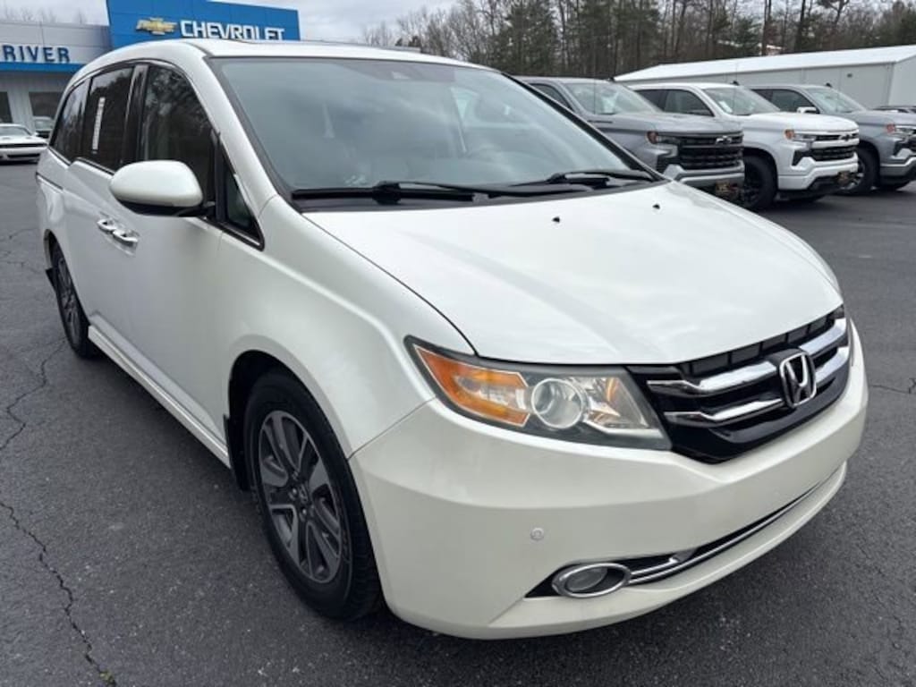 2015 Honda Odyssey FWD 6-Speed Automatic 3.5L V6 SOHC i-VTEC 24V 18 x 7 Alloy Wheels, 3rd row seats: split-bench, 4-Wheel Disc Brakes, 4.25 Axle Ratio, A/V remote, ABS brakes, Air Conditioning, Alloy wheels, AM/FM radio: SiriusXM, Anti-whiplash front head restraints, Auto-dimming Rear-View mirror, Automatic temperature control, Brake assist, Bumpers: body-color, CD player, Compass, Delay-off headlights, Driver door bin, Driver vanity mirror, Driver's Seat Mounted Armrest, Dual front impact airbags, Dual front side impact airbags, DVD-Audio, Electronic Stability Control, Exterior Parking Camera Rear, Four wheel independent suspension, Front anti-roll bar, Front Bucket Seats, Front dual zone A/C, Front fog lights, Front reading lights, Garage door transmitter: HomeLink, Headphones, Heated door mirrors, Heated Front Bucket Seats, Heated front seats, Illuminated entry, Leather Seat Trim, Leather Shift Knob, Leather steering wheel, Low tire pressure warning, Memory seat, Navigation System, Occupant sensing airbag, Outside temperature display, Overhead airbag, Overhead console, Panic alarm, Passenger door bin, Passenger seat mounted armrest, Passenger vanity mirror, Power door mirrors, Power driver seat, Power Liftgate, Power moonroof, Power passenger seat, Power steering, Power windows, Radio data system, Rear air conditioning, Rear audio controls, Rear reading lights, Rear seat center armrest, Rear window defroster, Rear window wiper, Reclining 3rd row seat, Remote keyless entry, Security system, Speed control, Speed-sensing steering, Speed-Sensitive Wipers, Split folding rear seat, Spoiler, Steering wheel mounted audio controls, Tachometer, Telescoping steering wheel, Tilt steering wheel, Traction control, Trip computer, Turn signal indicator mirrors, Variably intermittent wipers.