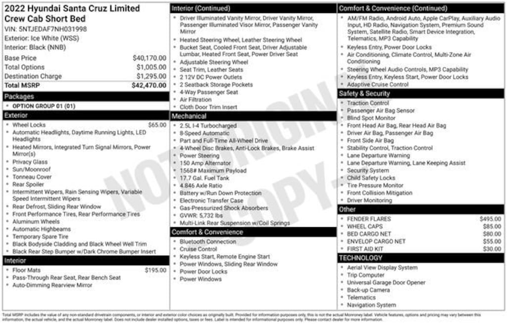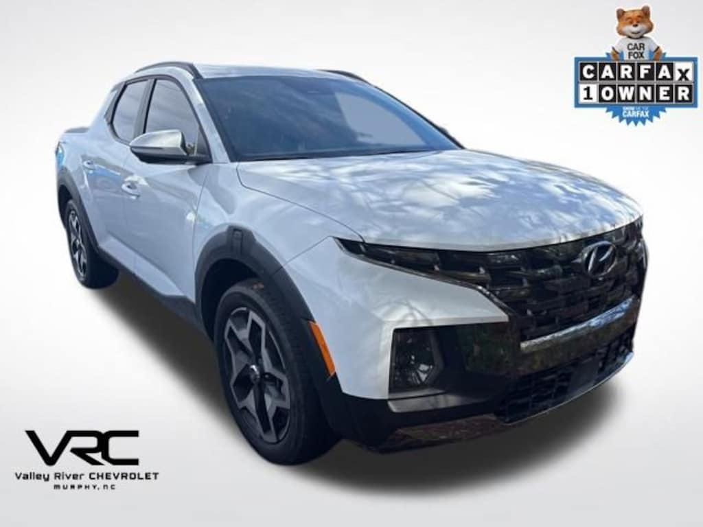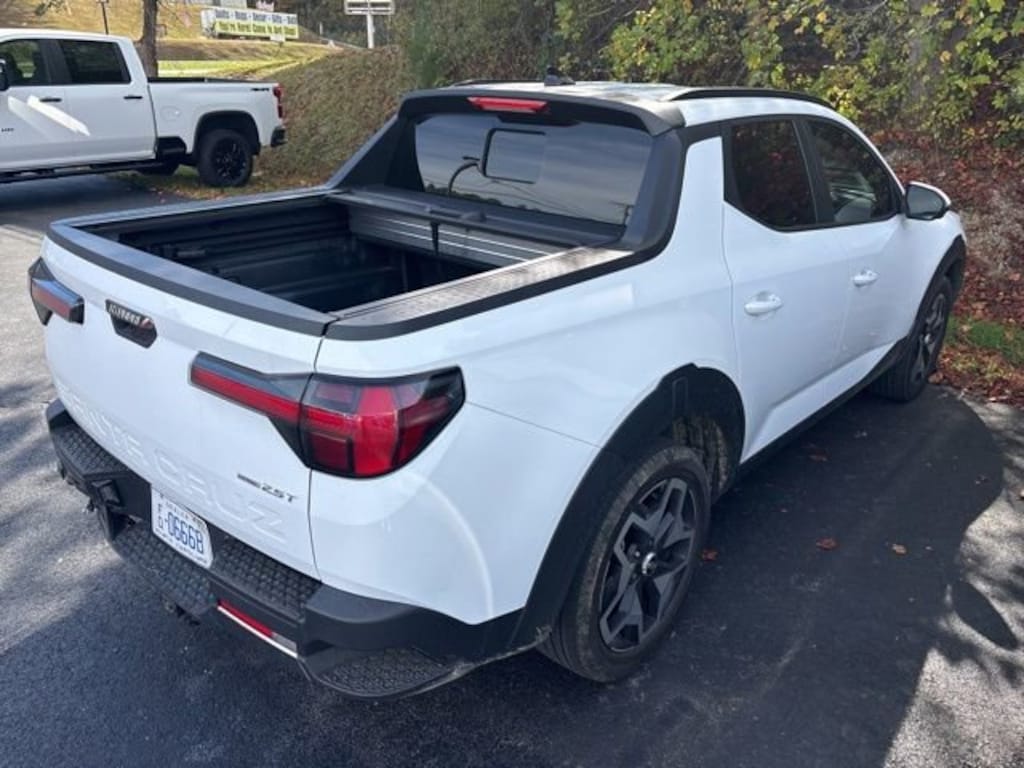 Ice White 2022 Hyundai Santa Cruz Limited AWD Shiftronic 2.5L I4 4-Wheel Disc Brakes, 4.846 Axle Ratio, 8 Speakers, ABS brakes, Air Conditioning, Alloy wheels, AM/FM radio: SiriusXM, Apple CarPlay & Android Auto, Auto High-beam Headlights, Auto-dimming Rear-View mirror, Auto-leveling suspension, Automatic temperature control, Bed Cargo Net, Brake assist, Bumpers: body-color, Carpeted Floor Mats, Delay-off headlights, Driver door bin, Driver vanity mirror, Dual front impact airbags, Dual front side impact airbags, Electronic Stability Control, Emergency communication system: Blue Link Connected Car Service (3-year complimentary subscription), Envelop Cargo Net, Exterior Parking Camera Rear, Fender Flares, First Aid Kit, Four wheel independent suspension, Front anti-roll bar, Front Bucket Seats, Front Center Armrest, Front dual zone A/C, Front reading lights, Fully automatic headlights, Garage door transmitter: HomeLink, Heated & Ventilated Front Bucket Seats, Heated door mirrors, Heated front seats, Heated steering wheel, Illuminated entry, Leather Seat Trim, Leather Shift Knob, Low tire pressure warning, Navigation System, Occupant sensing airbag, Option Group 01, Outside temperature display, Overhead airbag, Overhead console, Panic alarm, Passenger door bin, Passenger vanity mirror, Power door mirrors, Power driver seat, Power moonroof, Power steering, Power windows, Radio data system, Radio: AM/FM w/Bose Premium Audio System, Rain sensing wipers, Rear anti-roll bar, Rear step bumper, Rear window defroster, Remote keyless entry, Security system, Speed control, Speed-sensing steering, Split folding rear seat, Spoiler, Steering wheel mounted audio controls, Tachometer, Telescoping steering wheel, Tilt steering wheel, Traction control, Trip computer, Turn signal indicator mirrors, Variably intermittent wipers, Ventilated front seats, Wheel Caps, Wheel Locks, Wheels: 20 x 7.5J Alloy.