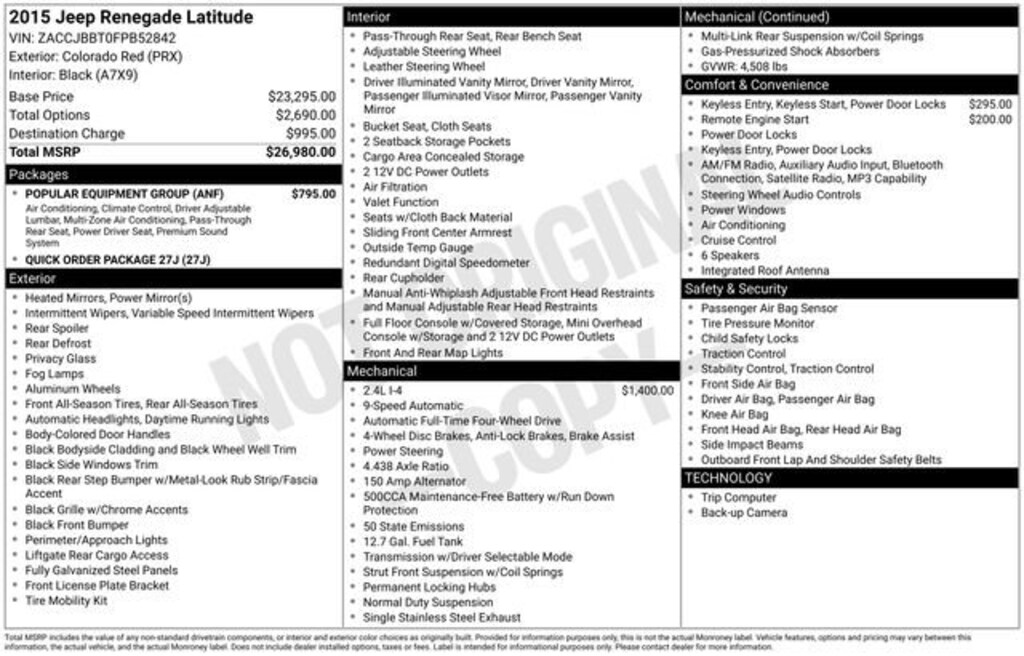Colorado Red 2015 Jeep Renegade Latitude 4WD 9-Speed 948TE Automatic 2.4L I4 MultiAir 115V Auxiliary Power Outlet, 16 x 6.5 Aluminum Wheels, 17 x 7.0 Aluminum Wheels, 4-Wheel Disc Brakes, 40/20/40 Rear Seat w/Trunk Pass-Thru, 6 Speakers, 9 Amplified Speakers w/Subwoofer, ABS brakes, Air Conditioning, Air Conditioning ATC w/Dual Zone Control, Alloy wheels, AM/FM radio: SiriusXM, Anti-whiplash front head restraints, Brake assist, Cloth Low-Back Bucket Seats, Compass, Delay-off headlights, Driver door bin, Driver vanity mirror, Dual front impact airbags, Dual front side impact airbags, Electronic Stability Control, Four wheel independent suspension, Front anti-roll bar, Front Bucket Seats, Front Center Armrest, Front fog lights, Front reading lights, Fully automatic headlights, Heated door mirrors, Illuminated entry, Knee airbag, Leather steering wheel, Low tire pressure warning, Normal Duty Suspension, Occupant sensing airbag, Outside temperature display, Overhead airbag, Overhead console, Panic alarm, ParkView Rear Back-Up Camera, Passenger door bin, Passenger vanity mirror, Passive Entry/Keyless Go, Popular Equipment Group, Power 4-Way Driver Lumbar Adjust, Power 8-Way Driver Manual 4-Way Passenger Seats, Power door mirrors, Power steering, Power windows, Quick Order Package 27J, Radio data system, Radio: Uconnect 5.0 AM/FM/BT, Rear anti-roll bar, Rear reading lights, Rear window defroster, Rear window wiper, Remote keyless entry, Remote Start System, Roof rack: rails only, Speed control, Split folding rear seat, Spoiler, Steering wheel mounted audio controls, Tachometer, Telescoping steering wheel, Tilt steering wheel, Traction control, Trip computer, Variably intermittent wipers, Voltmeter.Recent Arrival! 21/29 City/Highway MPGAwards:* 2015 KBB.com 10 Most Fun SUVs * 2015 KBB.com 10 Most Awarded Cars * 2015 KBB.com Our 10 Favorite New-for-2015 Cars * 2015 KBB.com 10 Coolest New Cars Under $18,000 * 2015 KBB.com 10 Tech-Savviest Cars Under $20,000 * 2015 KBB.com 10 Best All-Wheel Drive Vehicles Under $25,000 * 2015 KBB.com 10 Best Used Subcompact SUVs Under $15,000 * 2015 KBB.com 10 Best SUVs Under $25,000Reviews:* Lots of character; agile handling; plenty of easy-to-use technology features; best-in-class off-road capability for Trailhawk model. Source: Edmunds