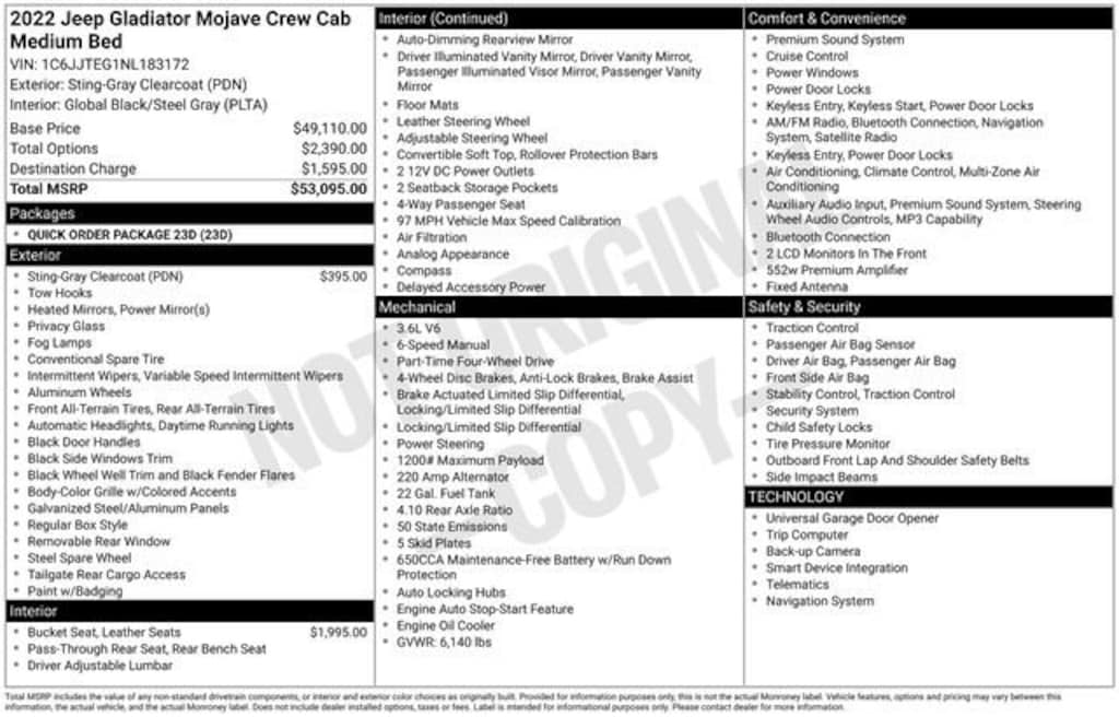 Sting-Gray Clearcoat 2022 Jeep Gladiator Mojave 4WD 6-Speed Manual 3.6L V6 24V VVT 4-Wheel Disc Brakes, 4.10 Rear Axle Ratio, 9 Speakers, ABS brakes, Air Conditioning, Alloy wheels, AM/FM radio: SiriusXM, Apple CarPlay/Android Auto, Auto-dimming Rear-View mirror, Automatic temperature control, Brake assist, Compass, Delay-off headlights, Driver door bin, Driver vanity mirror, Dual front impact airbags, Dual front side impact airbags, Electronic Stability Control, Emergency communication system: SiriusXM Guardian, Front anti-roll bar, Front Bucket Seats, Front Center Armrest w/Storage, Front dual zone A/C, Front fog lights, Front reading lights, Fully automatic headlights, Garage door transmitter, Heated door mirrors, Heavy Duty Suspension w/Gas Shocks, Illuminated entry, Integrated roll-over protection, Leather steering wheel, Low tire pressure warning, Navigation System, Occupant sensing airbag, Outside temperature display, Panic alarm, ParkView Rear Back-Up Camera, Passenger door bin, Passenger vanity mirror, Power door mirrors, Power steering, Power windows, Premium Cloth Seats w/Sport Bolsters, Quick Order Package 23D, Radio data system, Radio: Uconnect 4C Nav w/8.4 Display, Rear anti-roll bar, Rear reading lights, Remote keyless entry, Security system, Speed control, Split folding rear seat, Steering wheel mounted audio controls, Tachometer, Telescoping steering wheel, Tilt steering wheel, Traction control, Trip computer, Variably intermittent wipers, Voltmeter, Wheels: 17 x 7.5 Low Gloss Black Aluminum.