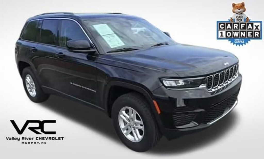 Diamond Black Crystal Pearlcoat 2023 Jeep Grand Cherokee Laredo 4WD 8-Speed Automatic 3.6L V6 24V VVT 4WD, 115V Auxiliary Power Outlet, 180 Amp Alternator, 3.45 Rear Axle Ratio, 4-Wheel Disc Brakes, 6 Speakers, ABS brakes, Air Conditioning, Alloy wheels, Anti-whiplash front head restraints, Automatic Headlamp Levelling System, Automatic temperature control, Brake assist, Bumpers: body-color, Cloth Seats, Compass, Delay-off headlights, Driver door bin, Driver vanity mirror, Dual front impact airbags, Dual front side impact airbags, Electronic Stability Control, Emergency communication system, Four wheel independent suspension, Front anti-roll bar, Front Bucket Seats, Front Center Armrest w/Storage, Front dual zone A/C, Front reading lights, Fully automatic headlights, Heated door mirrors, Heated Front Seats, Heated Steering Wheel, Heavy-Duty Engine Cooling, Illuminated entry, Knee airbag, Low tire pressure warning, Luxury Tech Group I, Molded In Color Black/Gloss Black Roof Rails, Normal Duty Suspension, Occupant sensing airbag, Outside temperature display, Overhead airbag, Overhead console, Panic alarm, ParkView Rear Back-Up Camera, Passenger door bin, Passenger vanity mirror, Power door mirrors, Power driver seat, Power Liftgate, Power steering, Power Sunroof (DISC), Power windows, Quick Order Package 23A Laredo, Radio data system, Radio: Uconnect 5 w/8.4 Display, Rain Sensitive Windshield Wipers, Rear anti-roll bar, Rear Load Levelling Suspension, Rear reading lights, Rear window defroster, Rear window wiper, Remote keyless entry, Remote Start System, Secondary Active Grille Shutters, Security system, Selectable Tire Fill Alert, Speed control, Speed-Sensitive Wipers, Split folding rear seat, Spoiler, Steering wheel mounted audio controls, Tachometer, Telescoping steering wheel, Tilt steering wheel, Traction control, Trailer Hitch Zoom, Trailer Tow Prep Group (B) (DISC), Trip computer, Variably intermittent wipers, Voltmeter, Wheels: 17 x 6.5 Fully Painted Aluminum, Wireless Charging Pad.