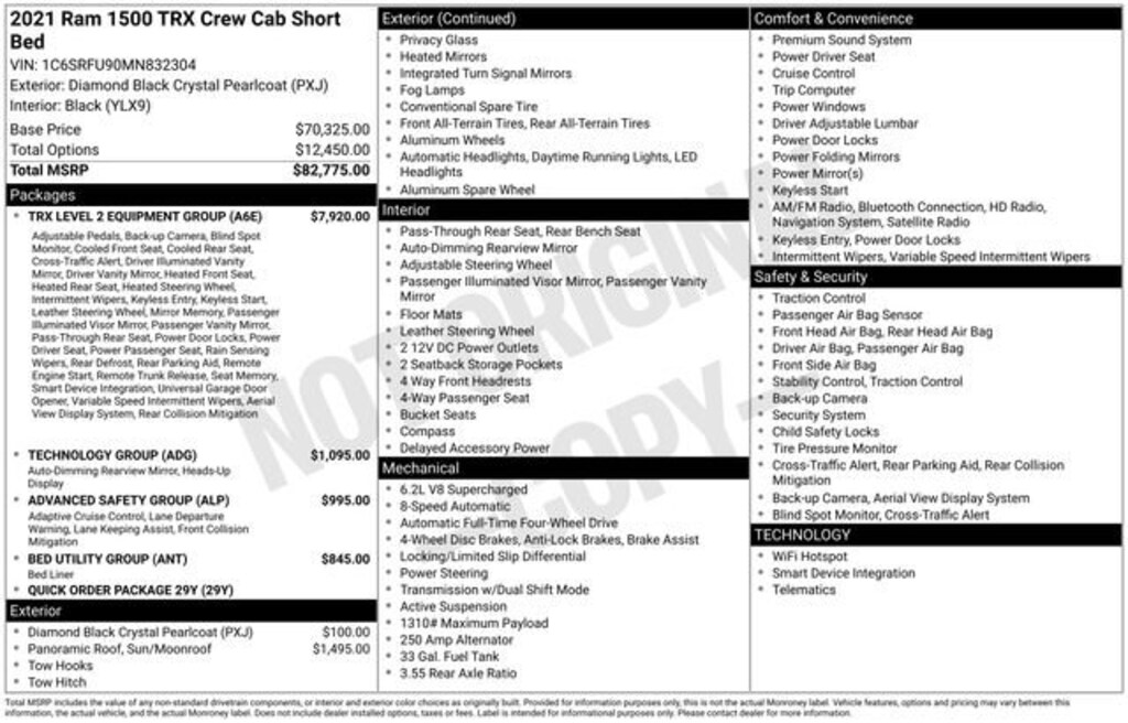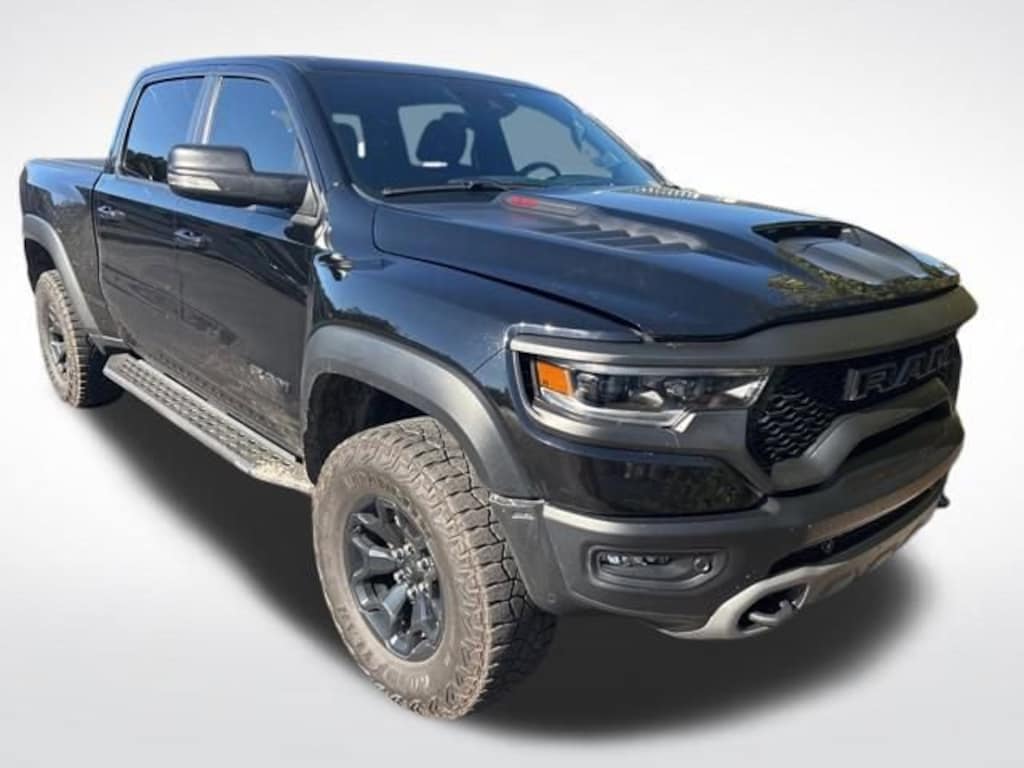 Diamond Black Crystal Pearlcoat 2021 Ram 1500 TRX 4WD 8-Speed Automatic 6.2L Supercharged HEMI V8 SRT 10 Speakers, 3.55 Rear Axle Ratio, 4 Way Front Headrests, 4-Wheel Disc Brakes, ABS brakes, Adaptive Cruise Control w/Stop & Go, Adaptive suspension, Advanced Safety Group, Air Conditioning, Alloy wheels, AM/FM radio: SiriusXM with 360L, Apple CarPlay/Android Auto, Auto High-beam Headlights, Auto-dimming door mirrors, Auto-dimming Rear-View mirror, Automatic temperature control, Bed Utility Group, Black Exterior Mirrors, Blind Spot & Cross Path Detection, Body Color Door Handles, Brake assist, Bucket Seats, Cloth/Vinyl Bucket Seats, Compass, Delay-off headlights, Dome Dual LED Reading Lamp, Driver door bin, Driver Seat Memory, Driver/Passenger Wrapped Assist Handles, Dual front impact airbags, Dual front side impact airbags, Dual-Pane Panoramic Sunroof, Electronic Stability Control, Emergency communication system: SiriusXM Guardian, Exterior Mirrors Courtesy Lamps, Exterior Mirrors w/Heating Element, Exterior Mirrors w/Memory, Exterior Mirrors w/Supplemental Signals, Front anti-roll bar, Front Bucket Seats, Front Center Armrest w/Storage, Front Door Accent Lighting, Front dual zone A/C, Front fog lights, Front reading lights, Front wheel independent suspension, Full Length Premium Upgraded Floor Console, Fully automatic headlights, Heads-Up Display, Heated door mirrors, Heated Front Seats, Heated Second Row Seats, Heated Steering Wheel, Illuminated entry, IP LED Ambient Light Pipe, Lane Keep Assist, Leather Shift Knob, Leather steering wheel, Leather Trimmed Bucket Seats, Leather/Suede Flat-Bottom Steering Wheel, LED CHMSL Lamp, Low tire pressure warning, Luxury Front Door Trim Panel, MOPAR 4 Adjustable Cargo Tie-Down Hooks, MOPAR Deployable Bed Step, MOPAR Spray In Bedliner, Navigation System, Occupant sensing airbag, Outside temperature display, Overhead airbag, Overhead console, Panic alarm, ParkSense Front/Rear Park Assist w/Stop, ParkView Rear Back-Up Camera, Passenger door bin, Passenger vanity mirror, Pedestrian Emergency Braking, Pick-Up Box Lighting, Power 4-Way Driver Lumbar Adjust, Power 4-Way Passenger Lumbar Adjust, Power 8-Way Driver & Passenger Seats, Power Adjustable Pedals w/Memory, Power door mirrors, Power driver seat, Power steering, Power windows, Power-Folding Mirrors, Premium Wrapped IP Bezel, Quick Order Package 29Y, Radio data system, Radio: Uconnect 12 w/Navigation, Radio/Driver Seat/Mirrors/Pedals Memory, Rain Sensitive Windshield Wipers, Rear 60/40 Folding Split Recline Seat, Rear Door Accent Lighting, Rear seat center armrest, Rear step bumper, Rear Underseat Compartment Storage, Rear Window Defroster, Rearview Autodim Digital Display Mirror, Remote keyless entry, Remote Proximity Keyless Entry, Remote Start System, Remote Tailgate Release, Security system, Speed control, Split folding rear seat, Sport steering wheel, Steering wheel mounted audio controls, Sun Visors w/Illuminated Vanity Mirrors, Surround View Camera System, Tachometer, Technology Group, Telescoping steering wheel, Tilt steering wheel, Traction control, Trailer Brake Control, Trip computer, TRX Level 2 Equipment Group, Turn signal indicator mirrors, Universal Garage Door Opener, Variably intermittent wipers, Ventilated Front Seats, Ventilated Rear Seats, Voltmeter, Wheels: 18 x 9 Black Paint/Polish Aluminum, Wireless Charging Pad.