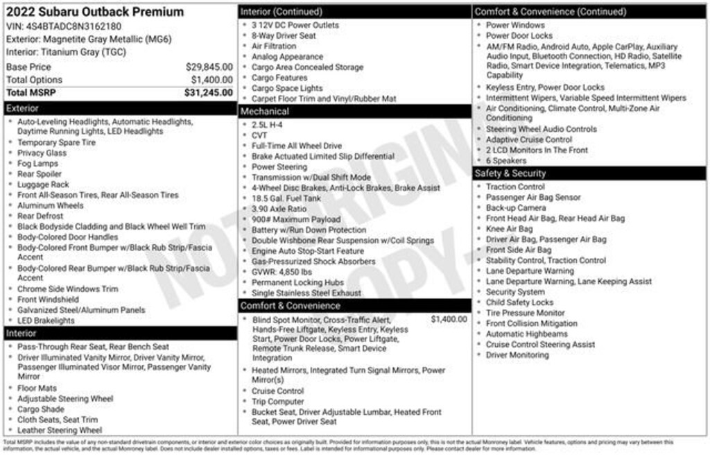 New Price! Magnetite Gray Metallic 2022 Subaru Outback Premium AWD CVT Lineartronic 2.5L 4-Cylinder DOHC 16V 3.90 Axle Ratio, 4-Wheel Disc Brakes, 6 Speakers, ABS brakes, Air Conditioning, Alloy wheels, AM/FM radio: SiriusXM, Auto High-beam Headlights, Automatic temperature control, Blind Spot Detection (BSD), Brake assist, BSD w/RCTA & Keyless Access & Push Button Start, Bumpers: body-color, Cloth Upholstery, Driver door bin, Driver vanity mirror, Dual front impact airbags, Dual front side impact airbags, Electronic Stability Control, Emergency communication system: STARLINK Safety and Security (Subscription Required), Exterior Parking Camera Rear, Four wheel independent suspension, Front anti-roll bar, Front Bucket Seats, Front Center Armrest w/Storage, Front dual zone A/C, Front fog lights, Front reading lights, Fully automatic headlights, Hands-Free Power Rear Gate, Heated door mirrors, Heated Front Bucket Seats, Heated front seats, Illuminated entry, Keyless Access w/Push Button Start, Knee airbag, Leather steering wheel, Low tire pressure warning, Occupant sensing airbag, Outside temperature display, Overhead airbag, Overhead console, Panic alarm, Passenger door bin, Passenger vanity mirror, Power door mirrors, Power driver seat, Power steering, Power windows, Radio: Subaru STARLINK 11.6 Multimedia Plus Sys, Rear anti-roll bar, Rear Cross Traffic Alert (RCTA), Rear seat center armrest, Rear window defroster, Rear window wiper, Remote keyless entry, Roof rack, Security system, Speed control, Speed-sensing steering, Split folding rear seat, Spoiler, STARLINK/Apple CarPlay/Android Auto, Steering wheel mounted audio controls, Steering Wheel Paddle Shift Control Switches, Tachometer, Telescoping steering wheel, Tilt steering wheel, Traction control, Trip computer, Turn signal indicator mirrors, Variably intermittent wipers, Wheels: 17 x 7J Black Aluminum Alloy.Recent Arrival! Odometer is 27163 miles below market average! 26/33 City/Highway MPG